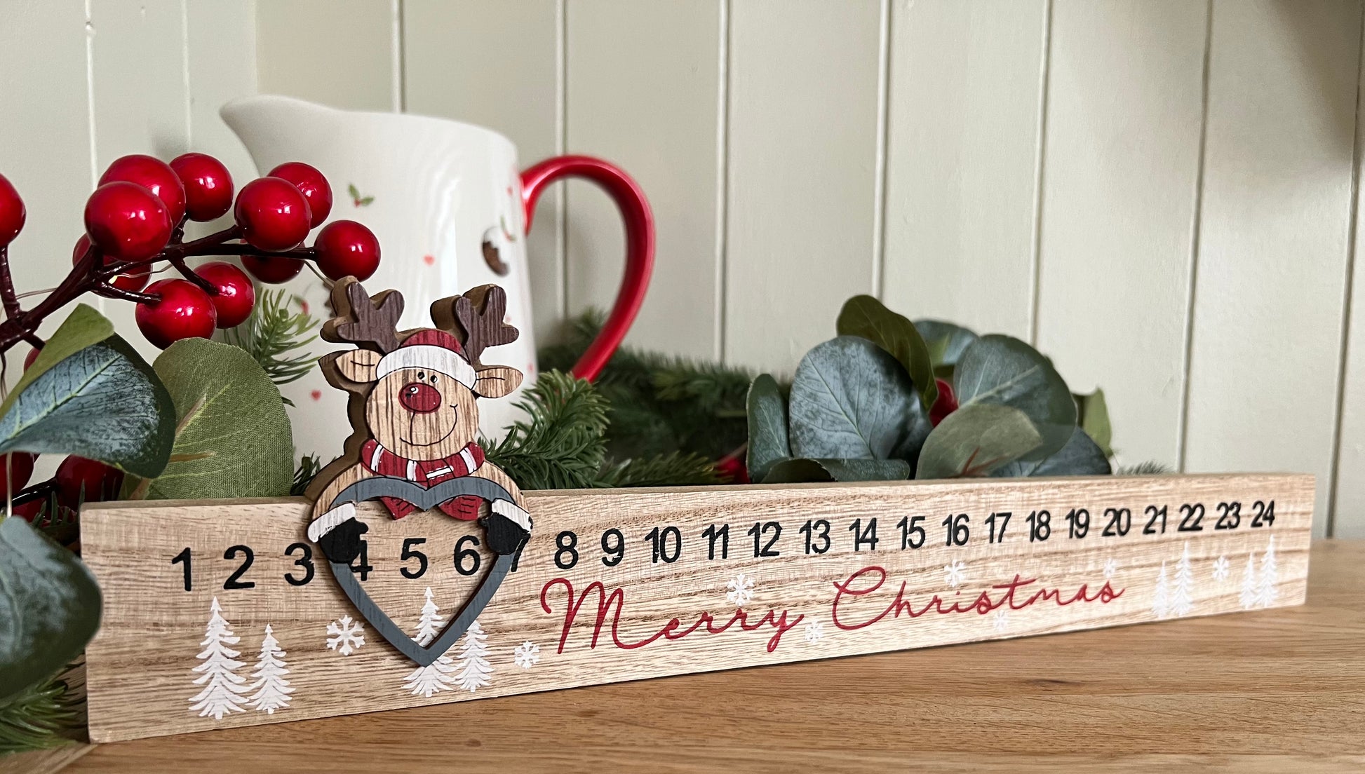A wooden advent countdown featuring a cute little reindeer that you can move along the days counting down until Christmas. A quirky take on an advent calendar.