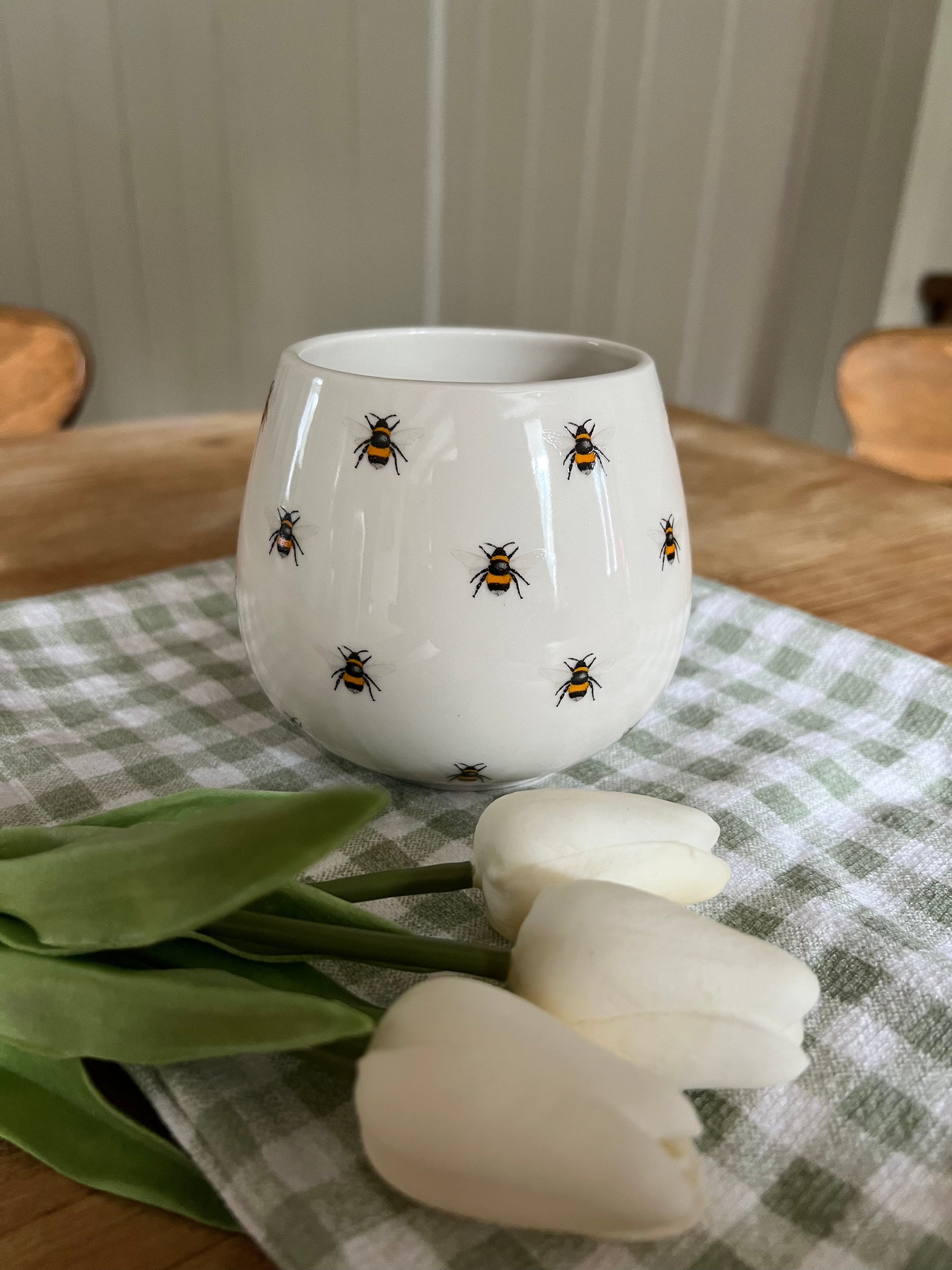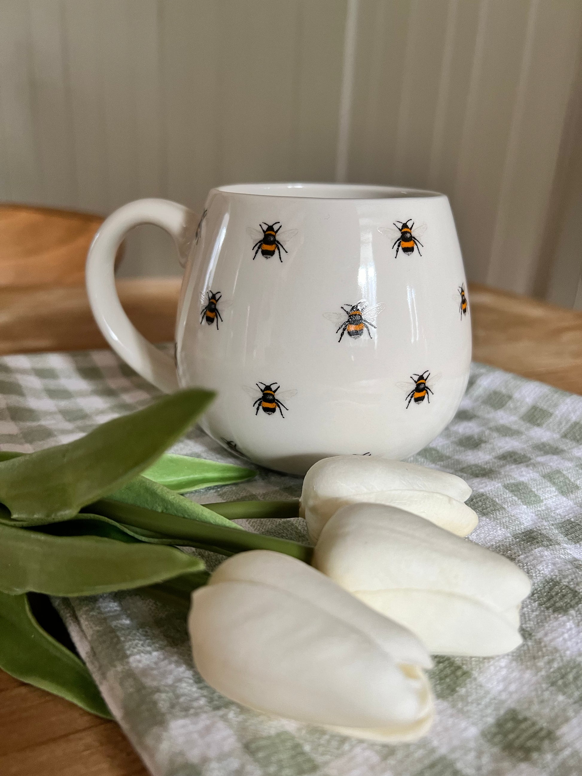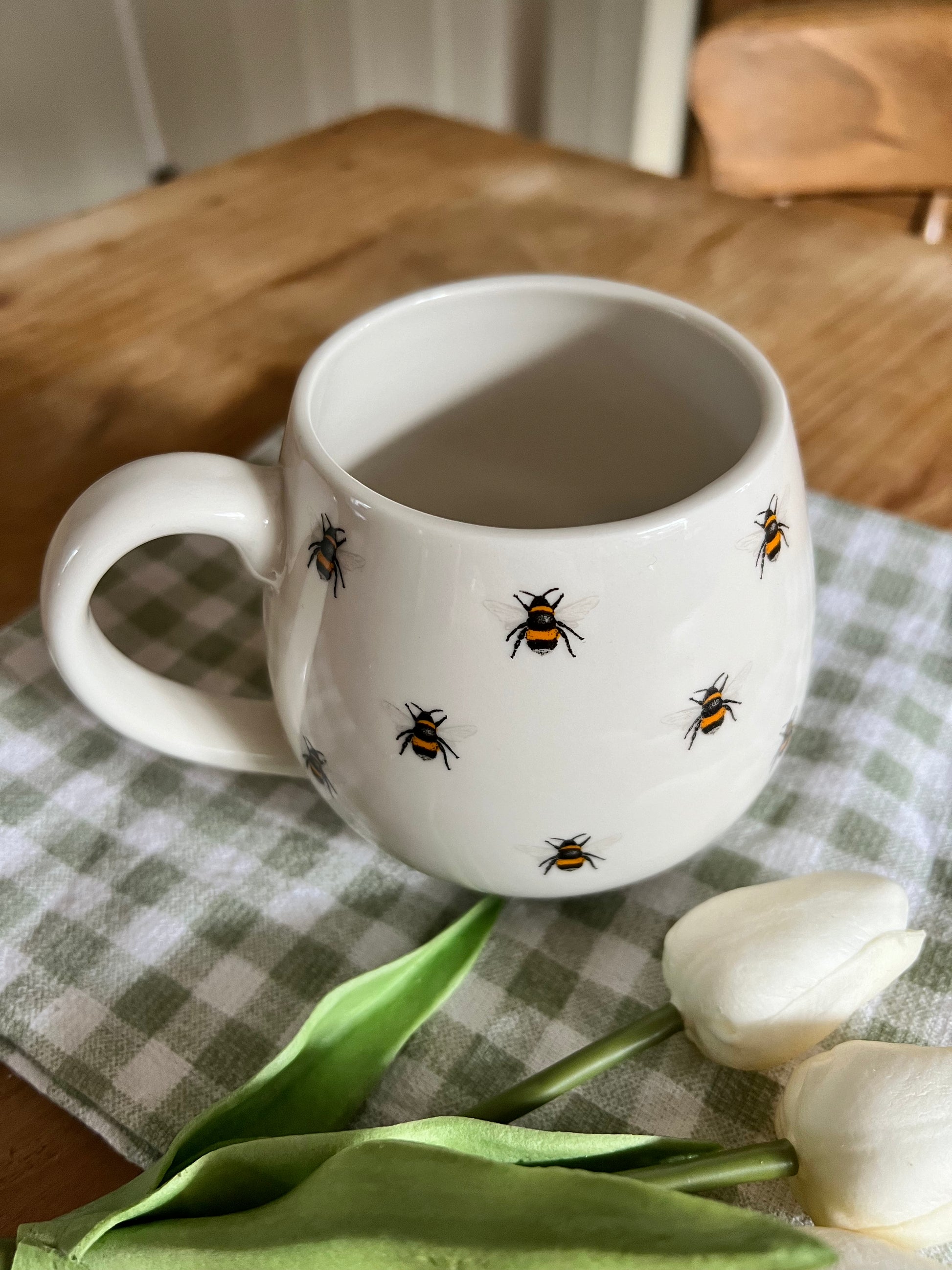 A simple sweet bee ceramic rounded mug featuring a lovely orange bee pattern and a white handle. The perfect home for a hot drink.