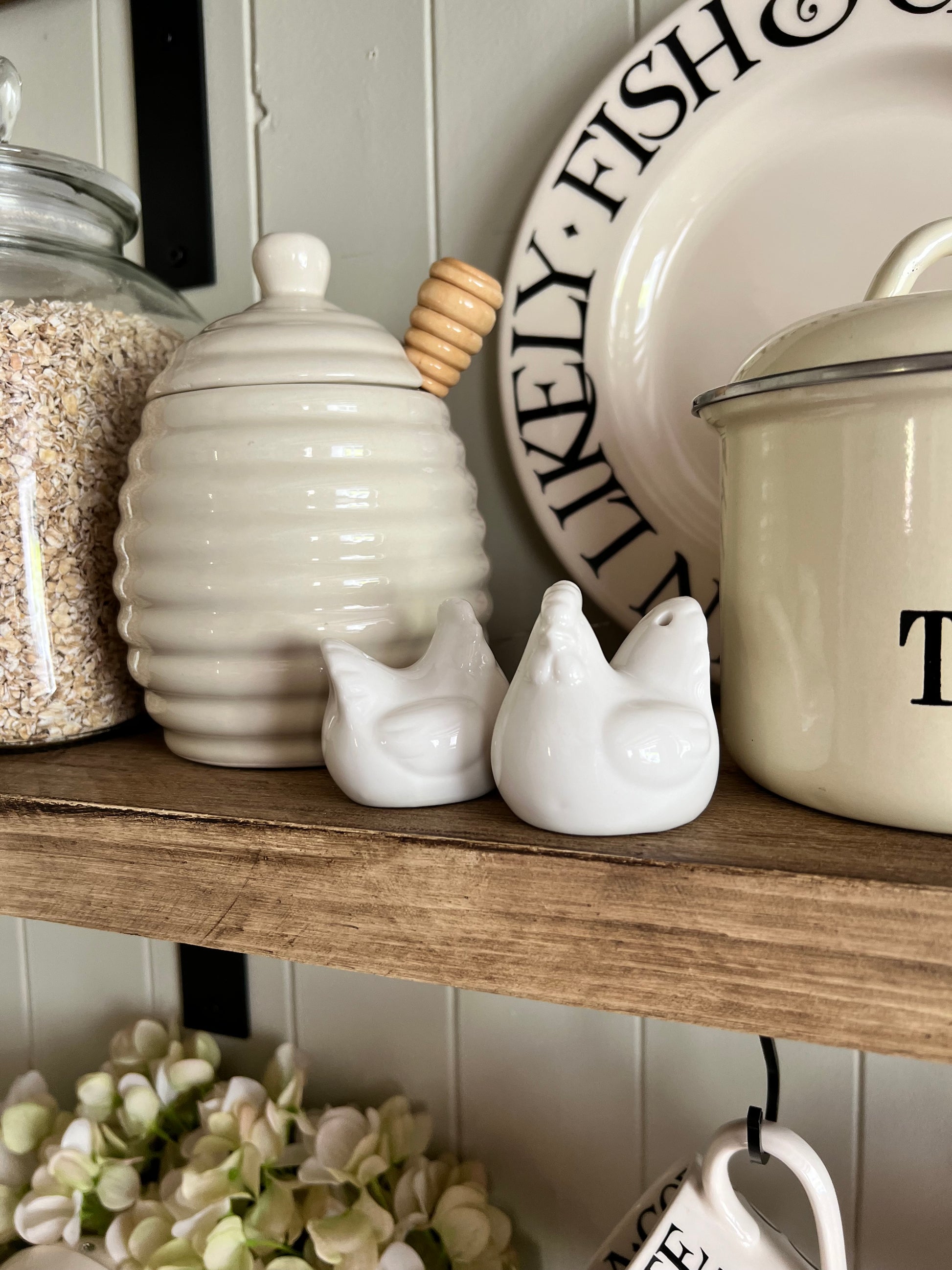 A charming salt and pepper set in the shape of 2 chickens. A chic farmhouse inspired item for your table.