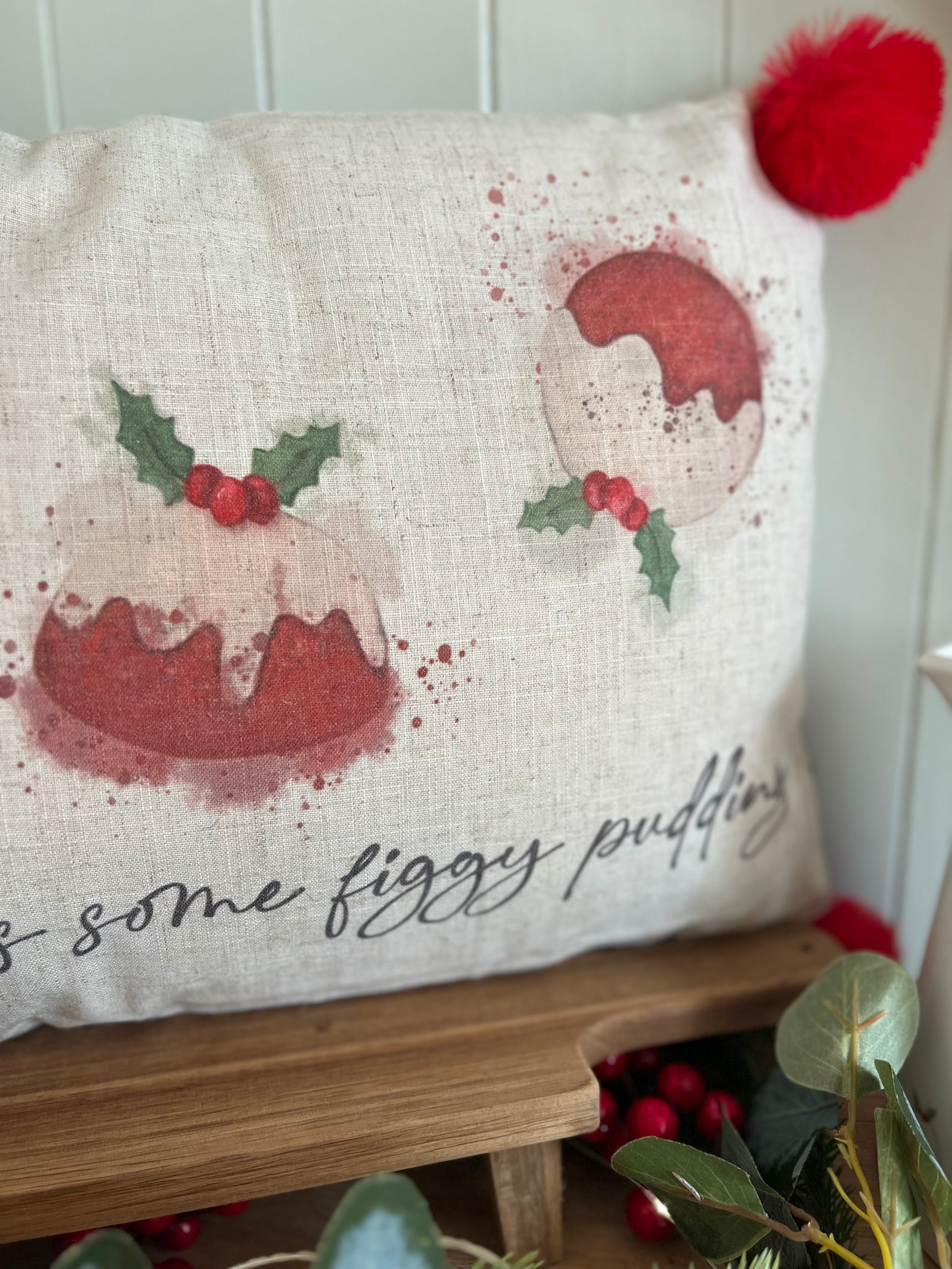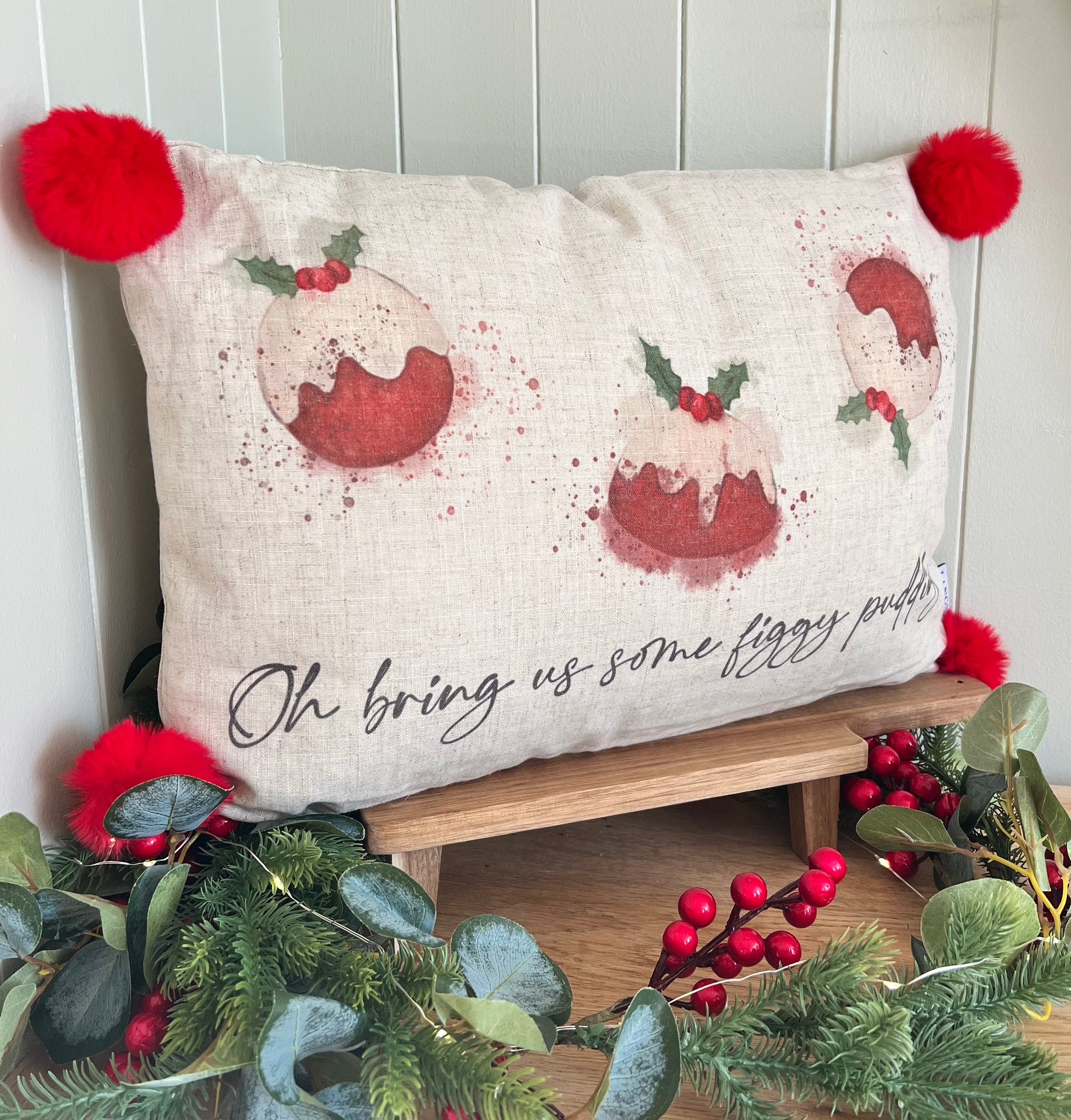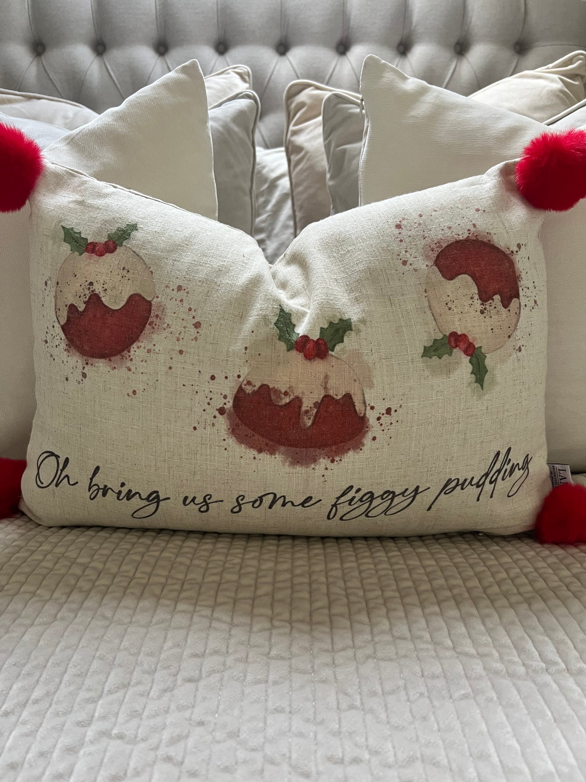 A gorgeous oatmeal coloured cushion with cute Christmas puddings and carol lyrics printed onto the front. The fluffy red pompoms on each corner make it even more adorable. The perfect cushion to display over Christmas.
