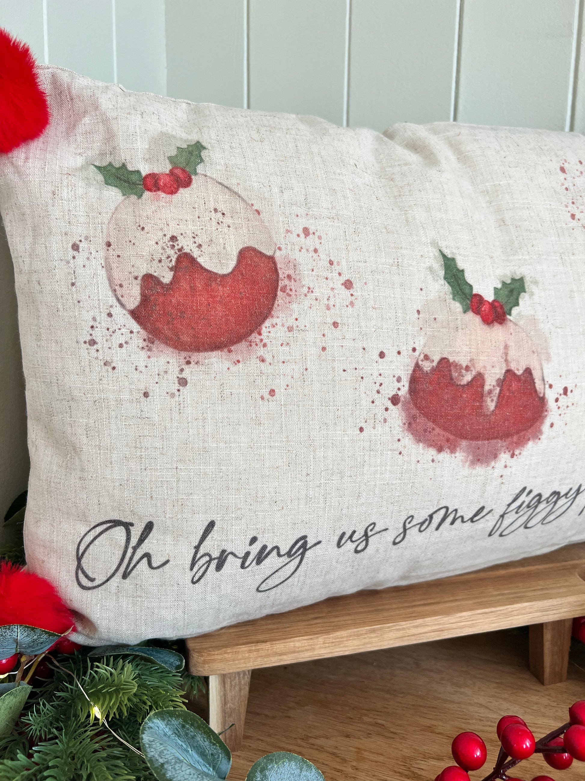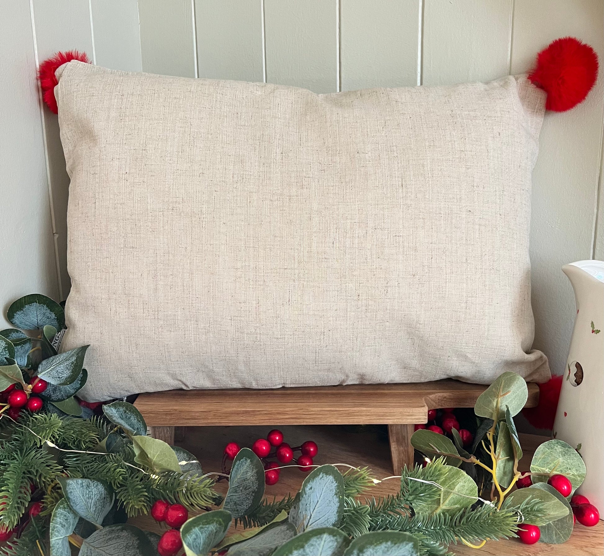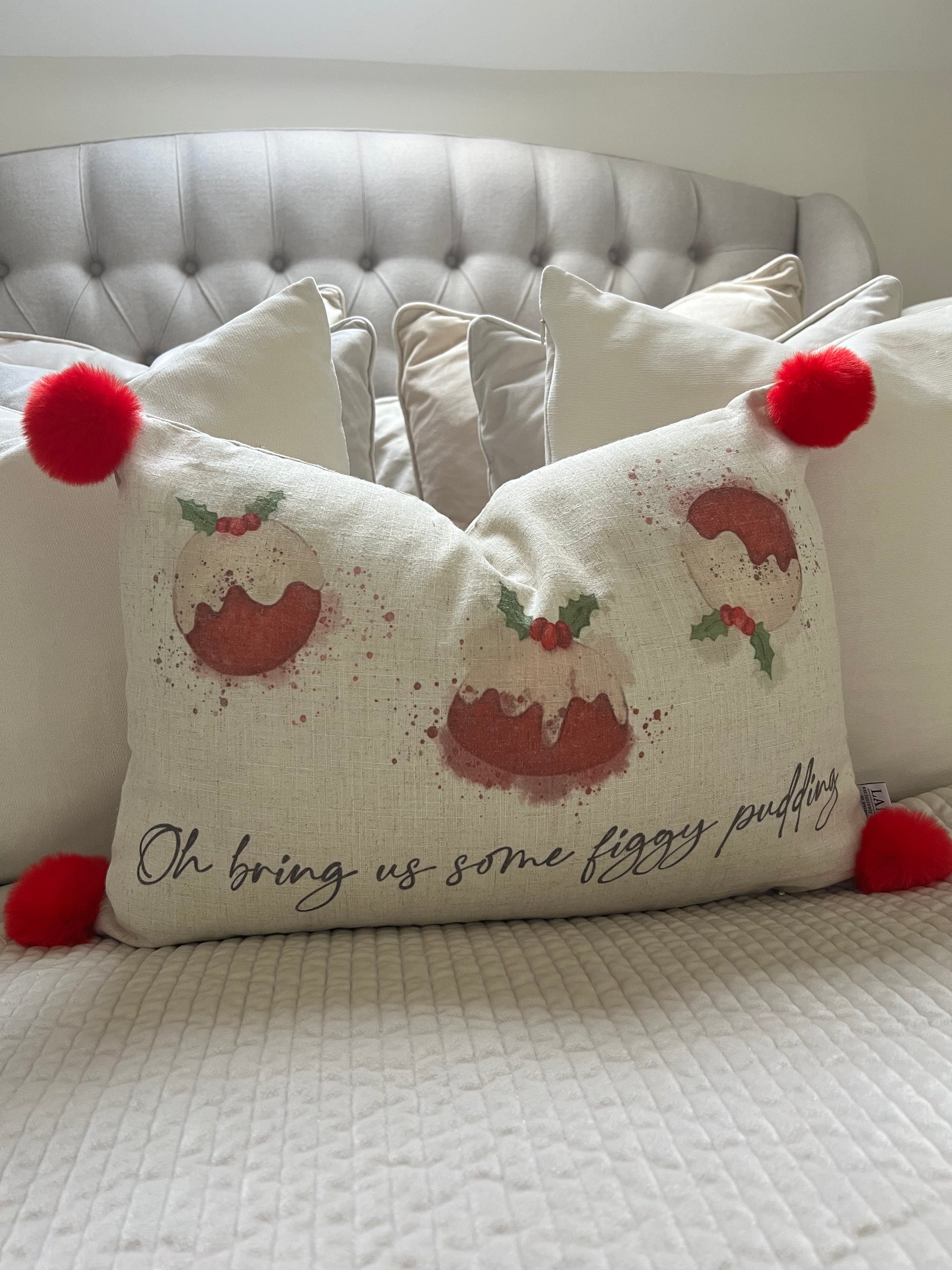 A gorgeous oatmeal coloured cushion with cute Christmas puddings and carol lyrics printed onto the front. The fluffy red pompoms on each corner make it even more adorable. The perfect cushion to display over Christmas.