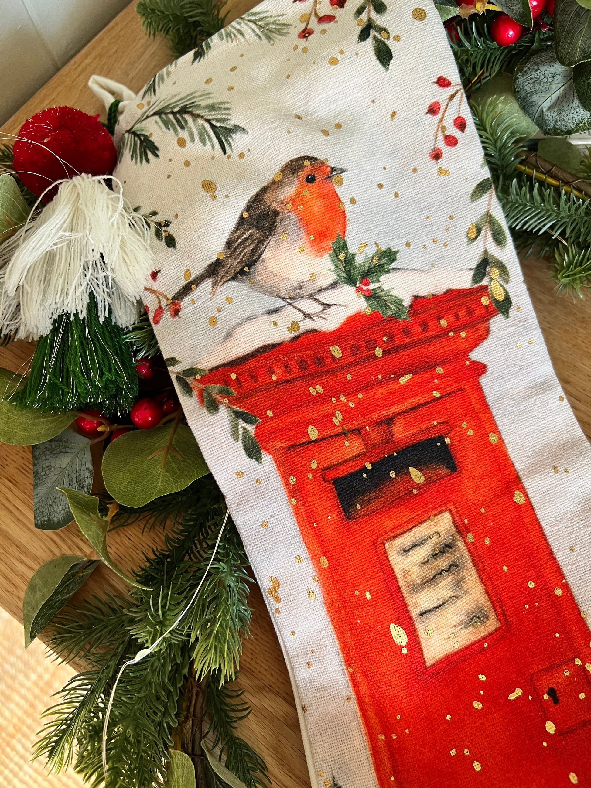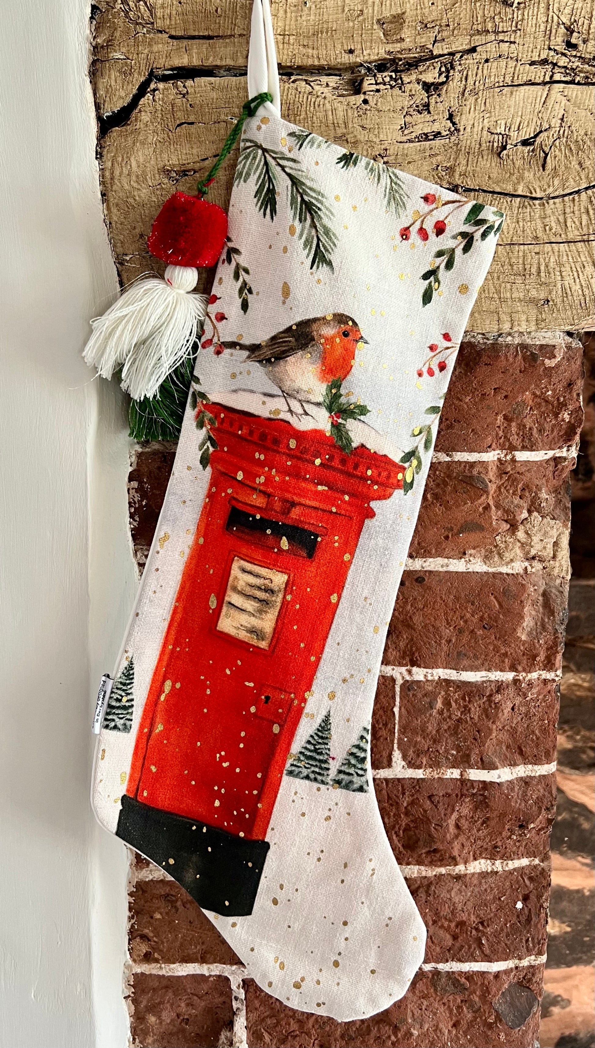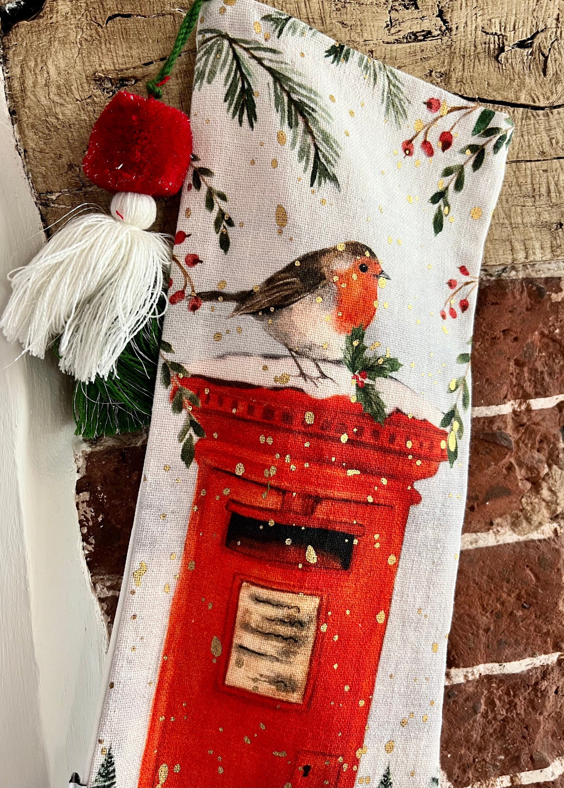 A stunning robin and postbox stocking with gold foil to add a touch of sparkle and magic this Christmas. The perfect Christmas stocking to display on your mantelpieces, fireplaces, or sideboards. A traditional style stocking topped off with an adorable pom pom and tassel.
