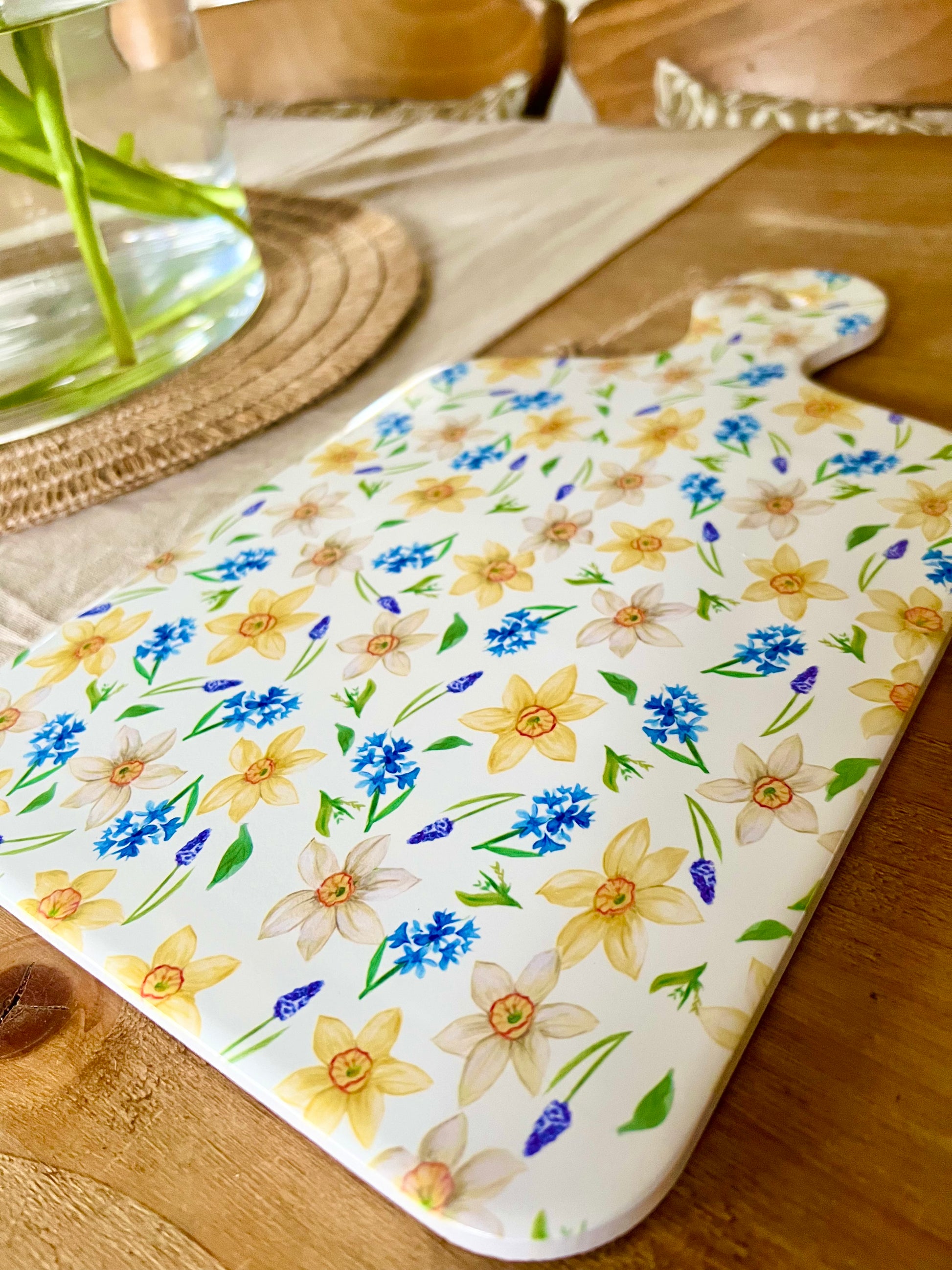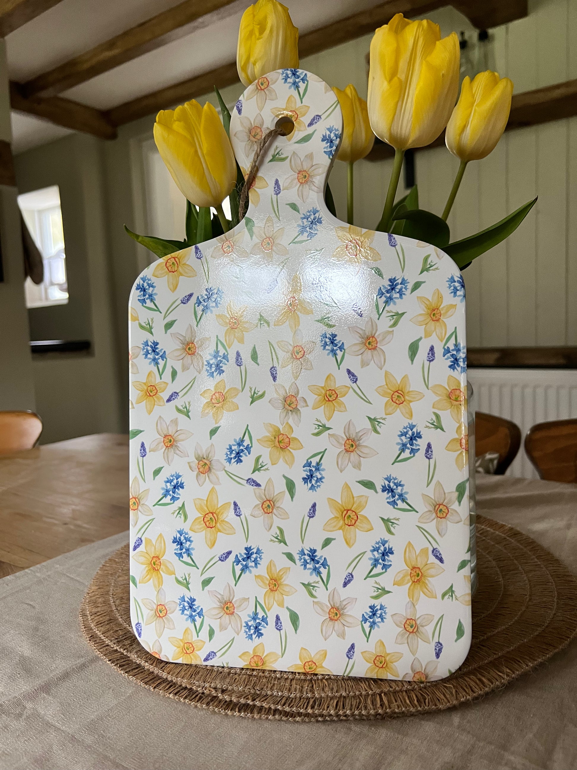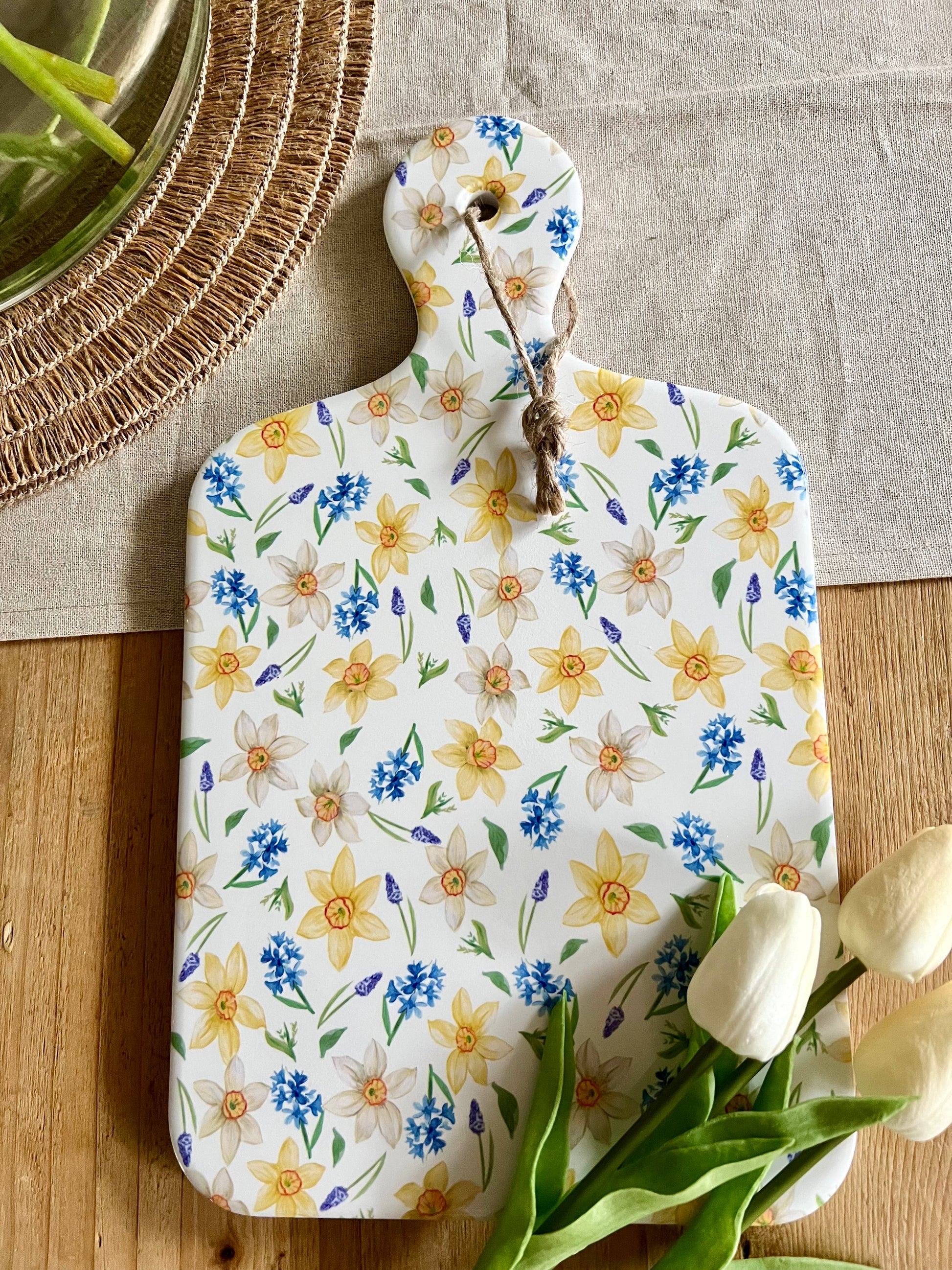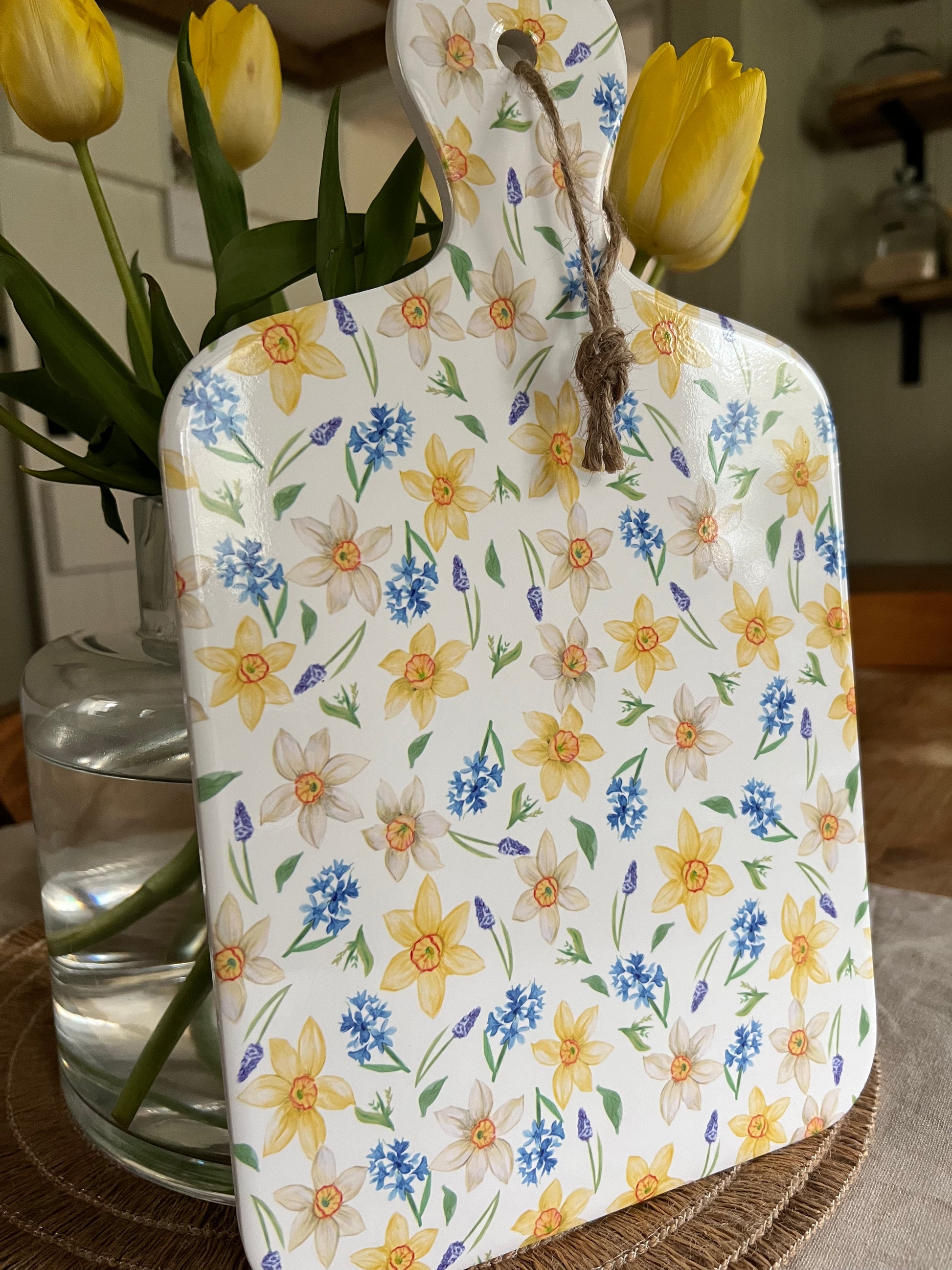 A gorgeous large ceramic trivet with a bright and colourful Spring inspired flower print of beautiful daffodils and hyacinths. A stunning trivet that can be used as a serving board or hung up using the jute rope.