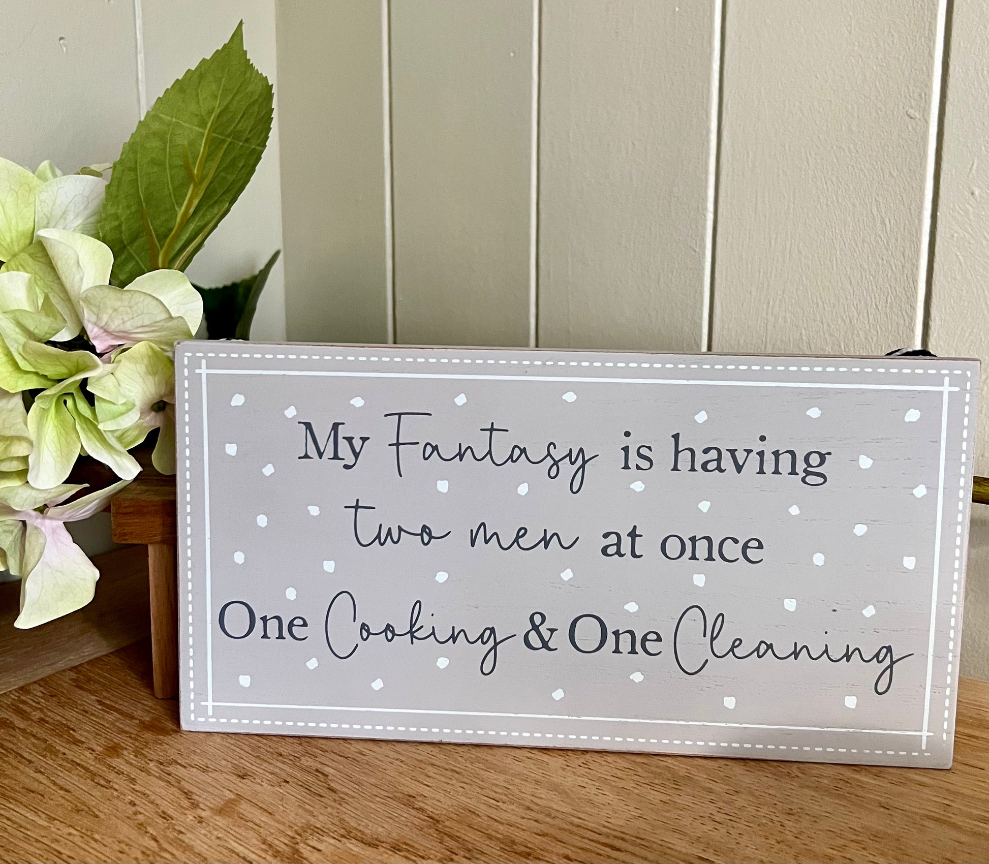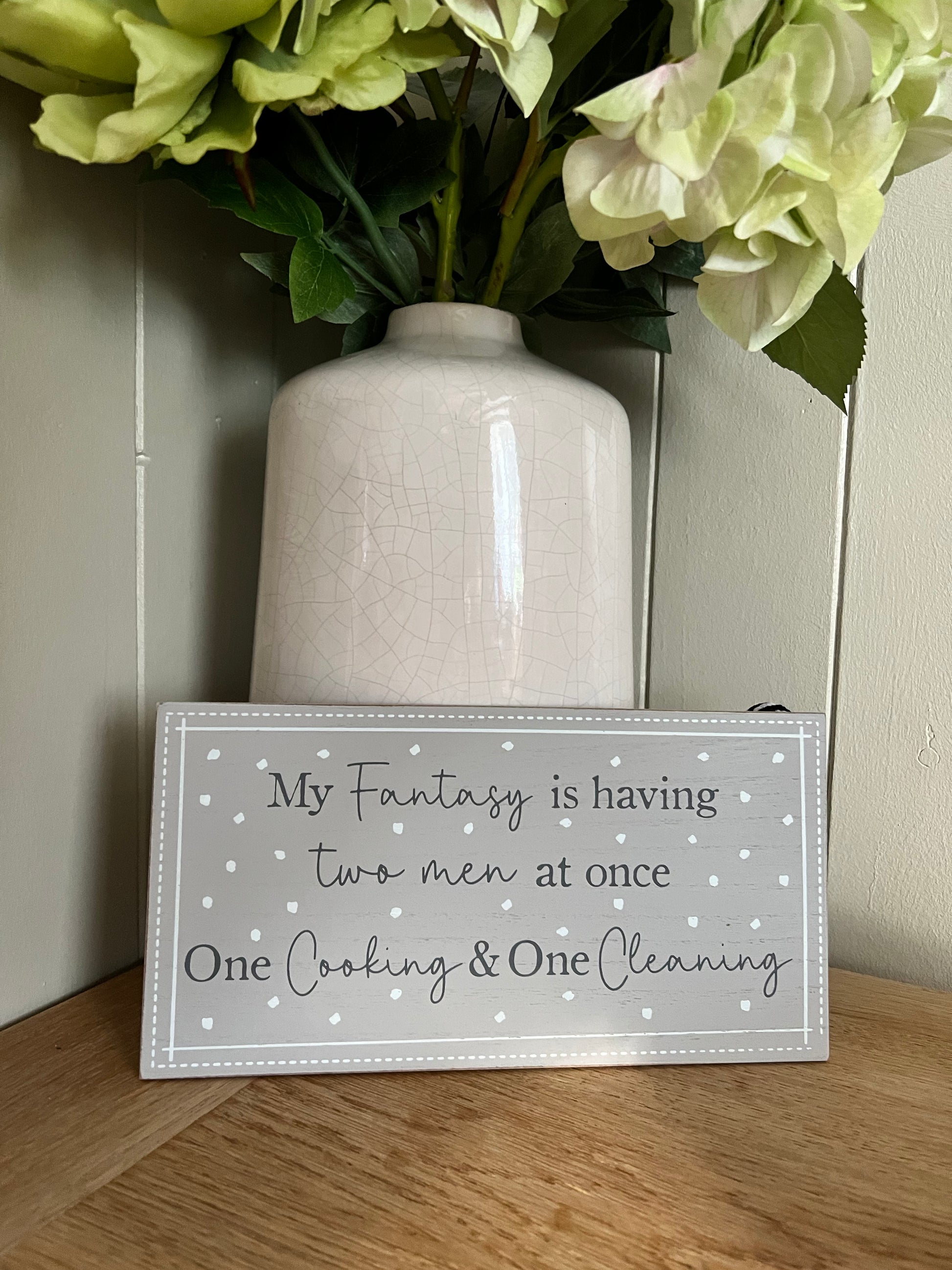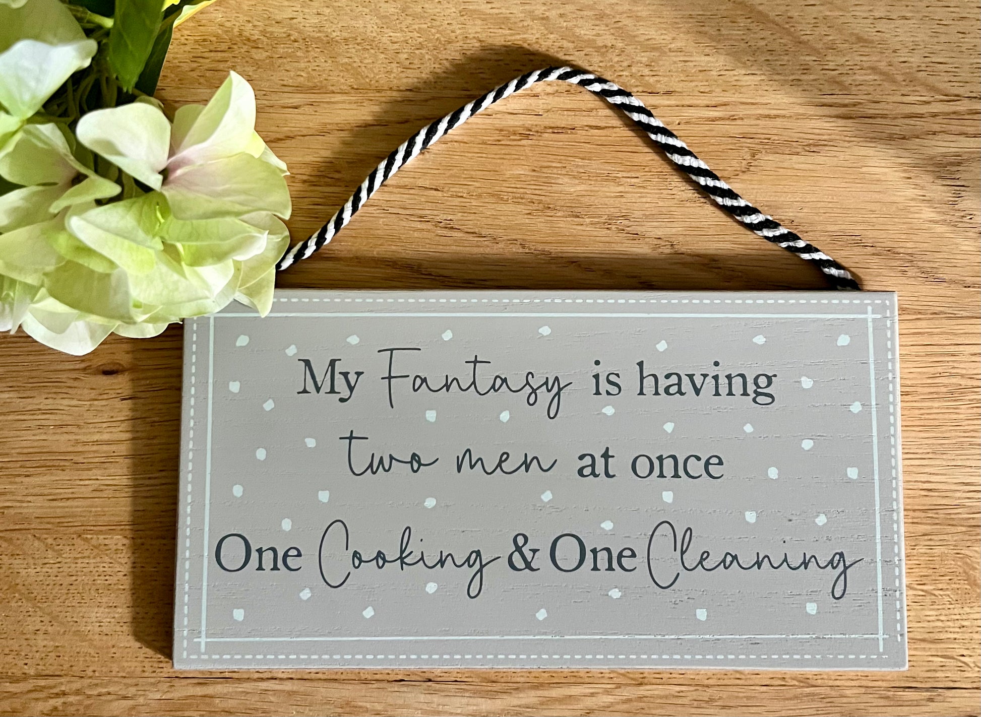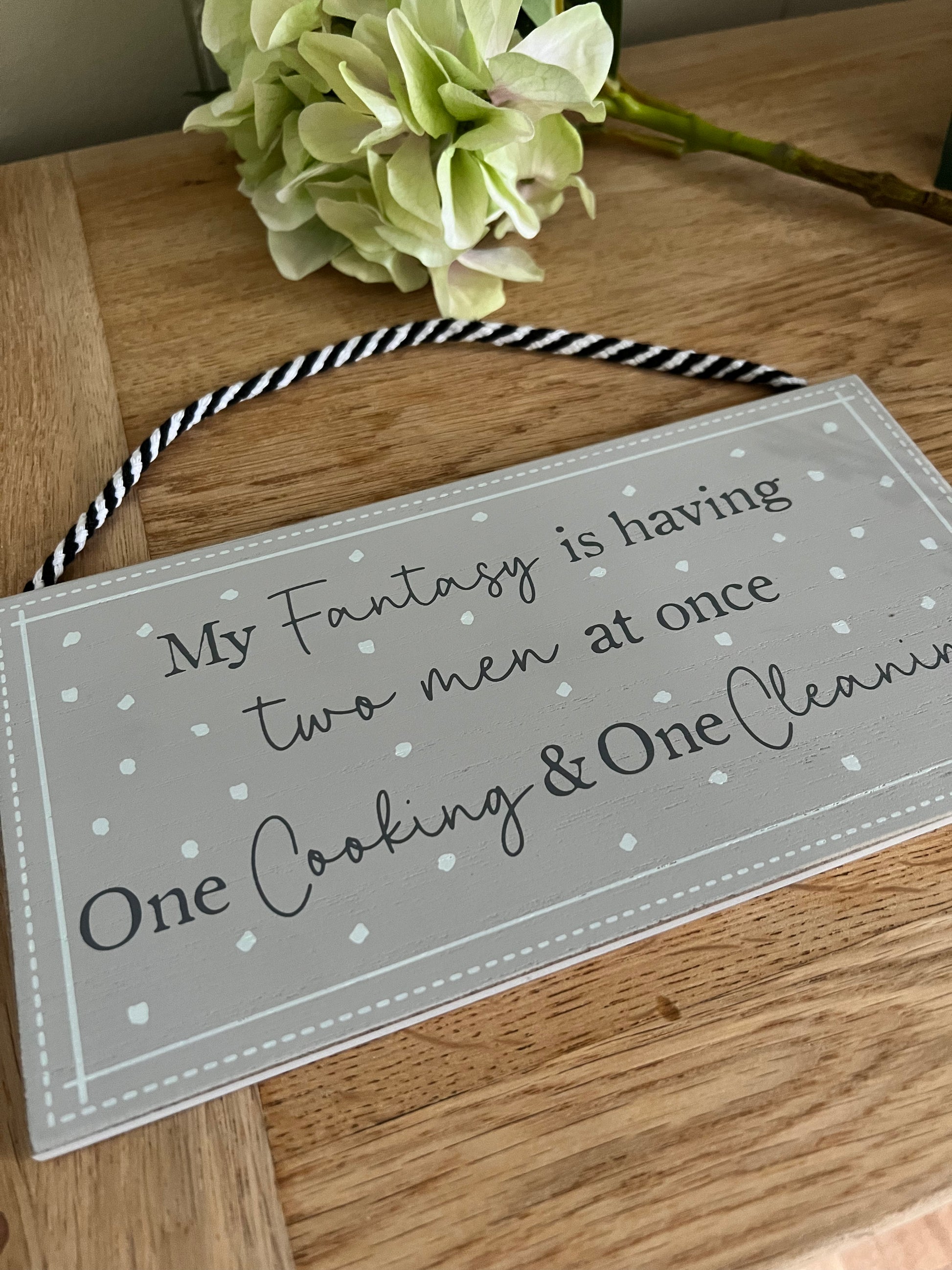A humorous grey wooden plaque with polka dot design. A quirky fantasy sign which might drop the hint to all those men out there!