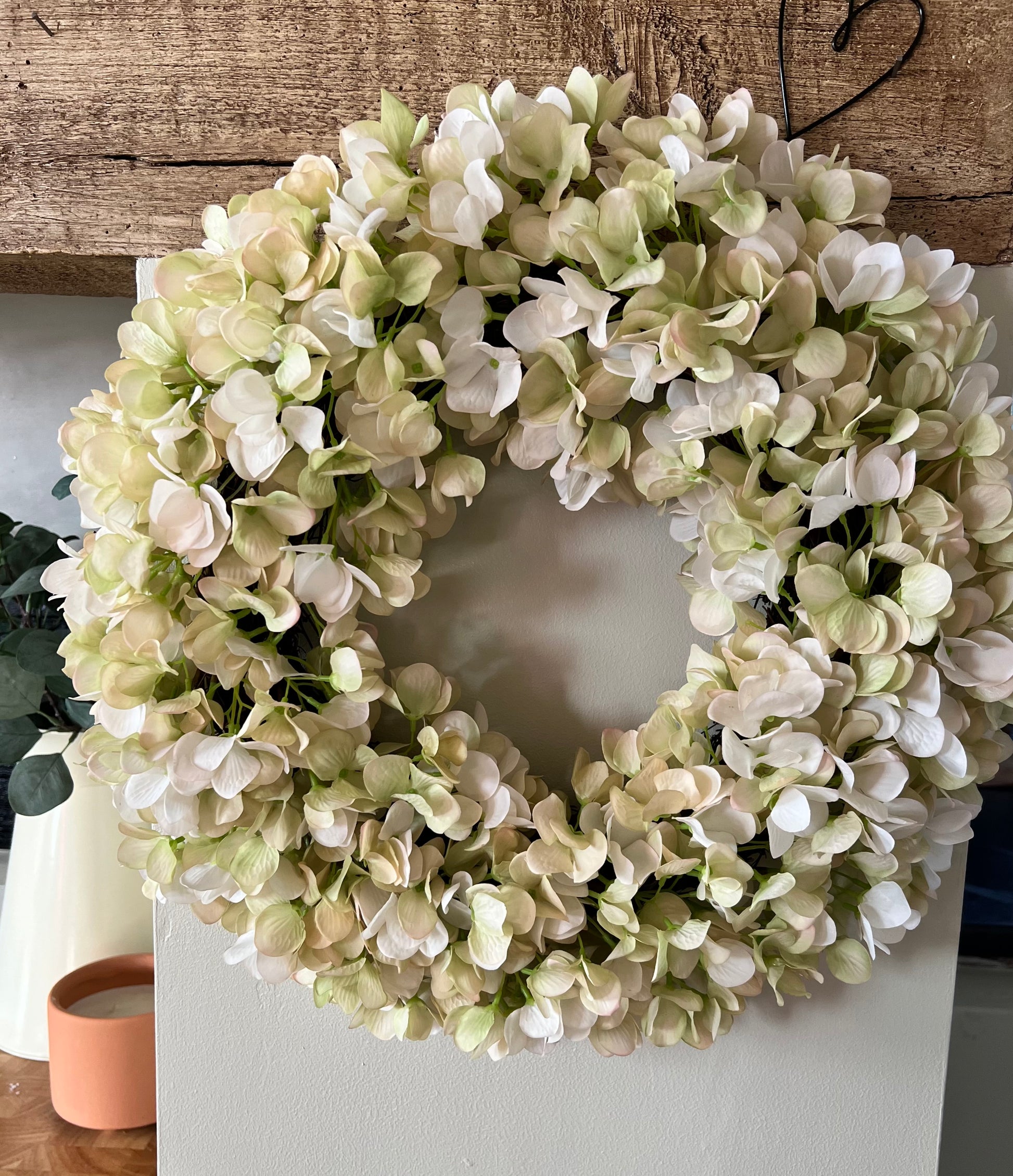 A stunning large faux hydrangea wreath, perfect for bringing in the season. With neutral fresh colours this is the most gorgeous Spring wreath that brings a fresh update to any room.