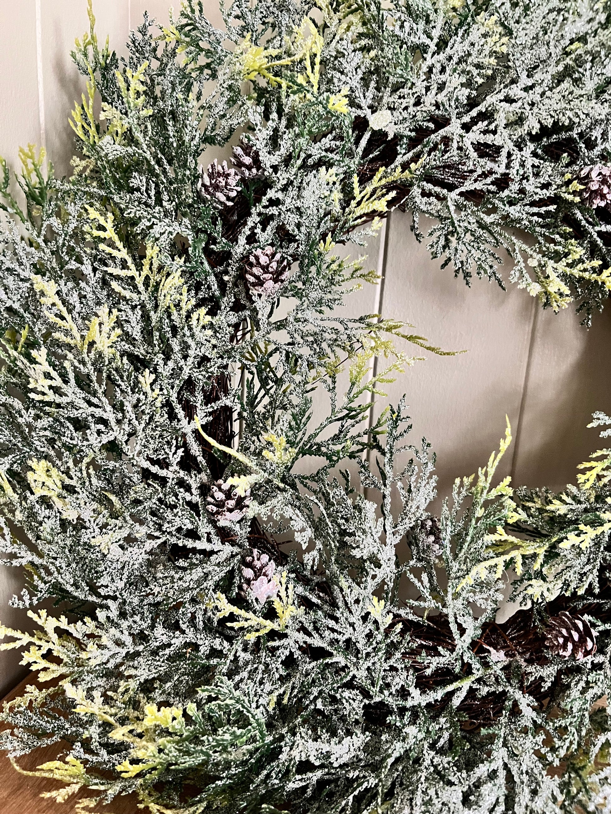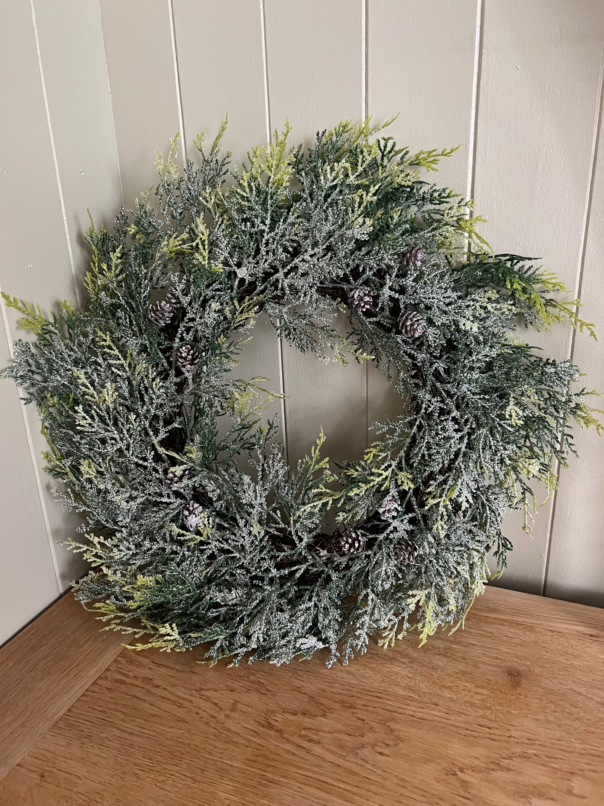 A gorgeous sparkly faux frosted pine wreath with small pine cones. A lovely glistening wreath perfect for hanging within your homes over the Christmas period. Would it really be Christmas without a bit of glitter?