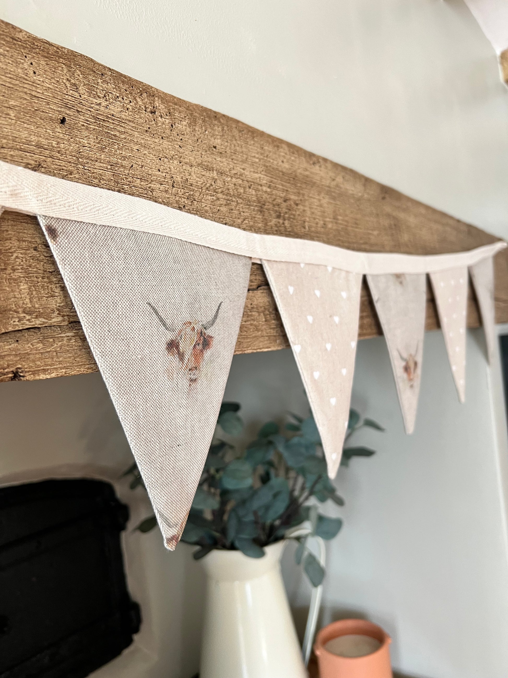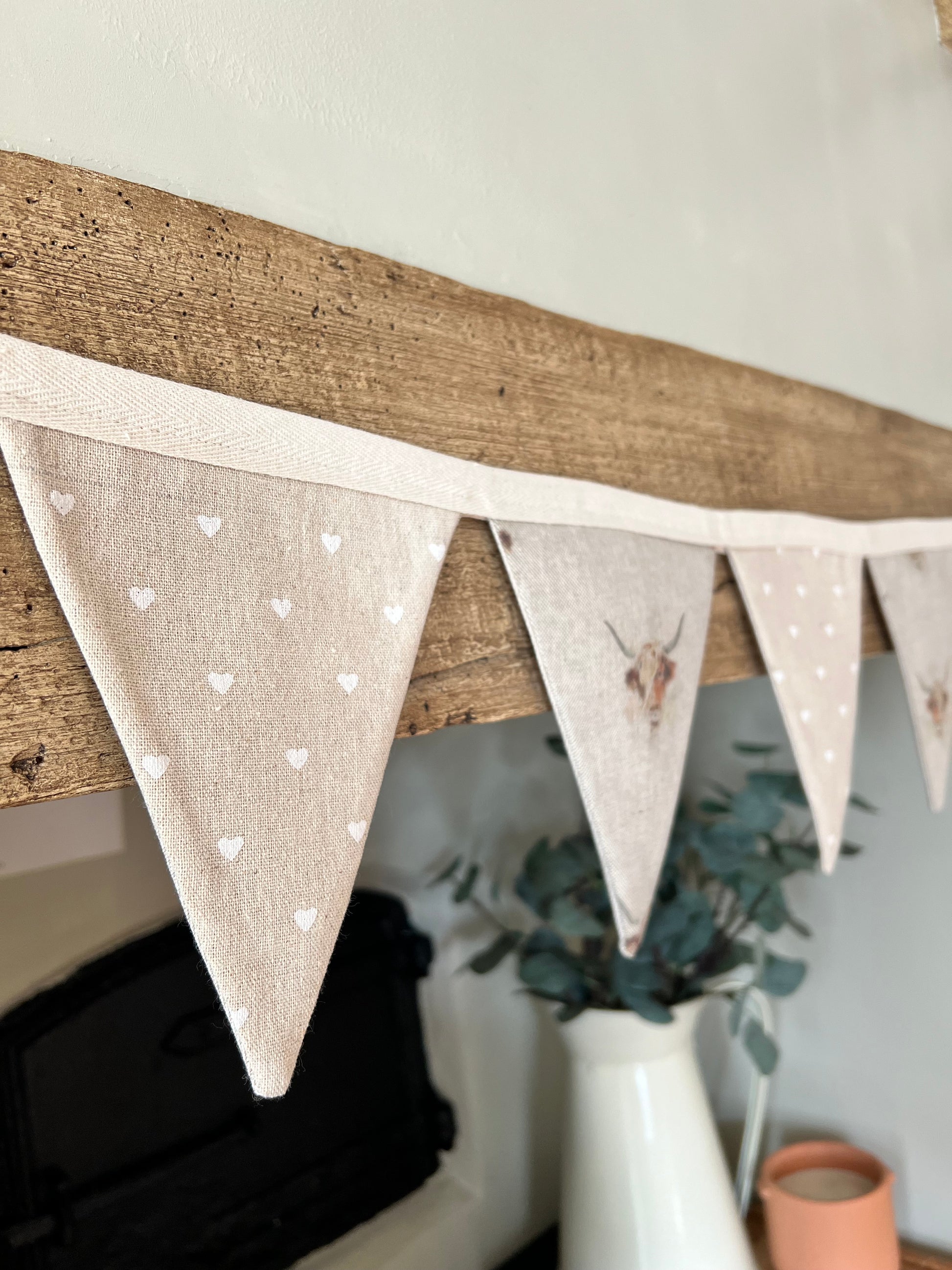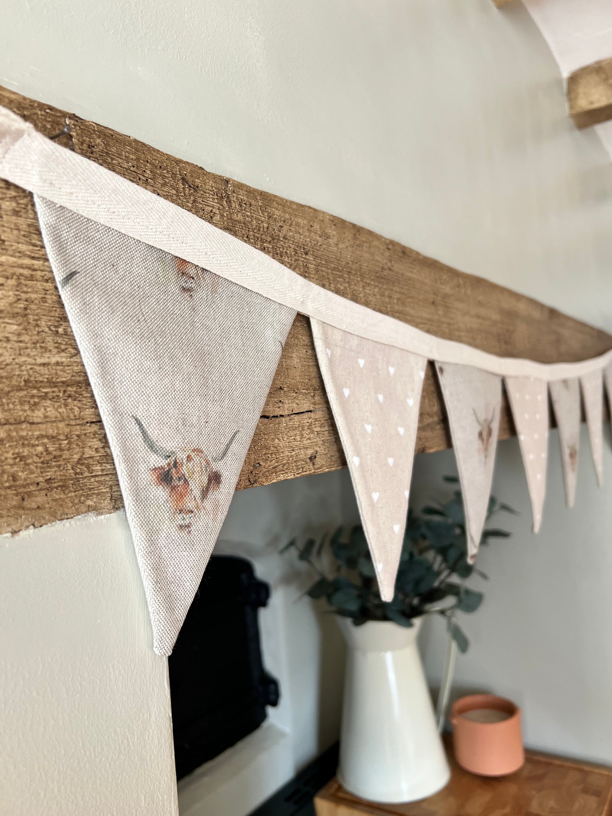 Our gorgeous highland cow and repeated heart print rustic style bunting made from cotton rich fabric and handmade by us at the Cottage! Each bunting is made to order and makes a lovely addition to any home. They are approximately 1.3 metres in length but due to each one being handmade no two are exactly the same.