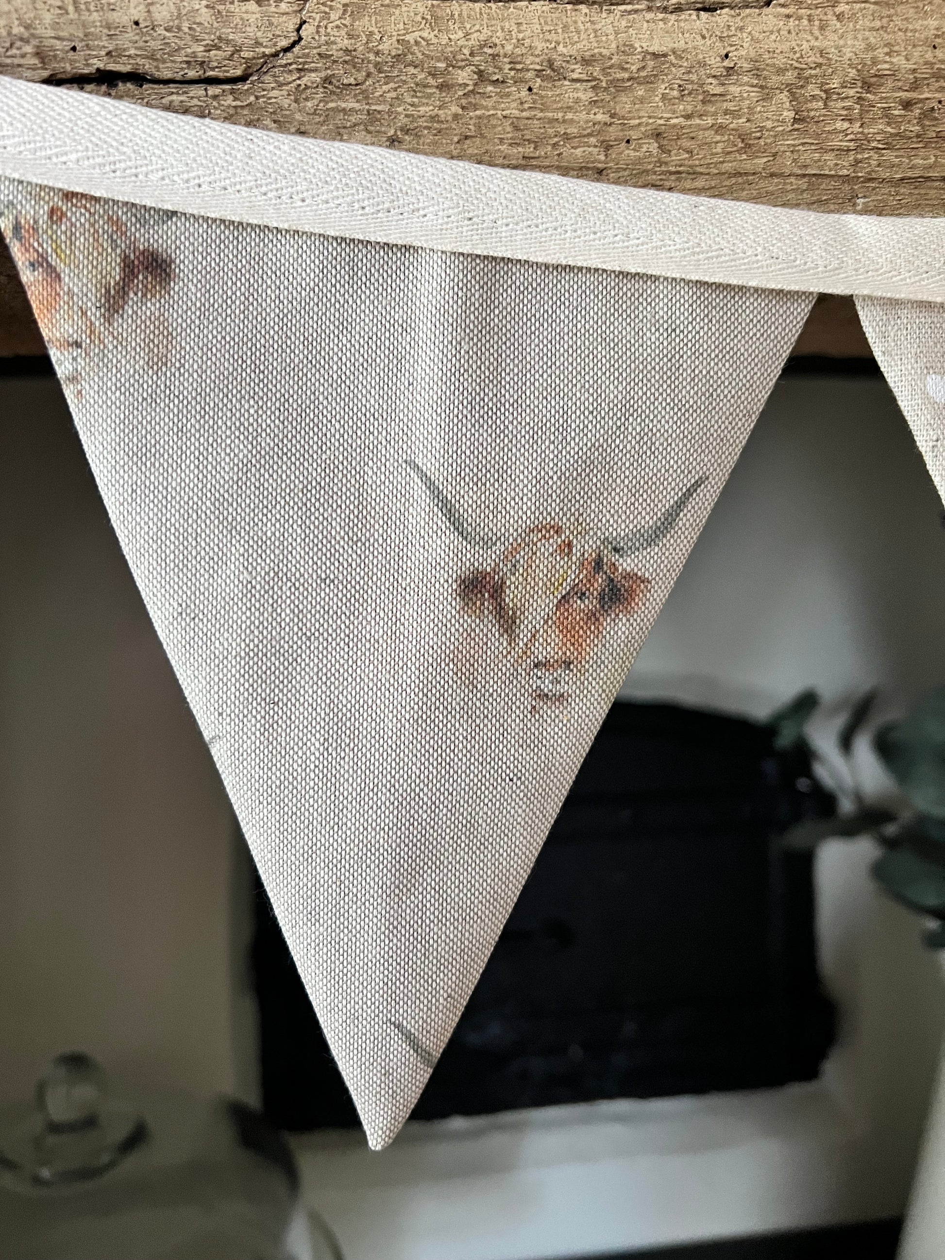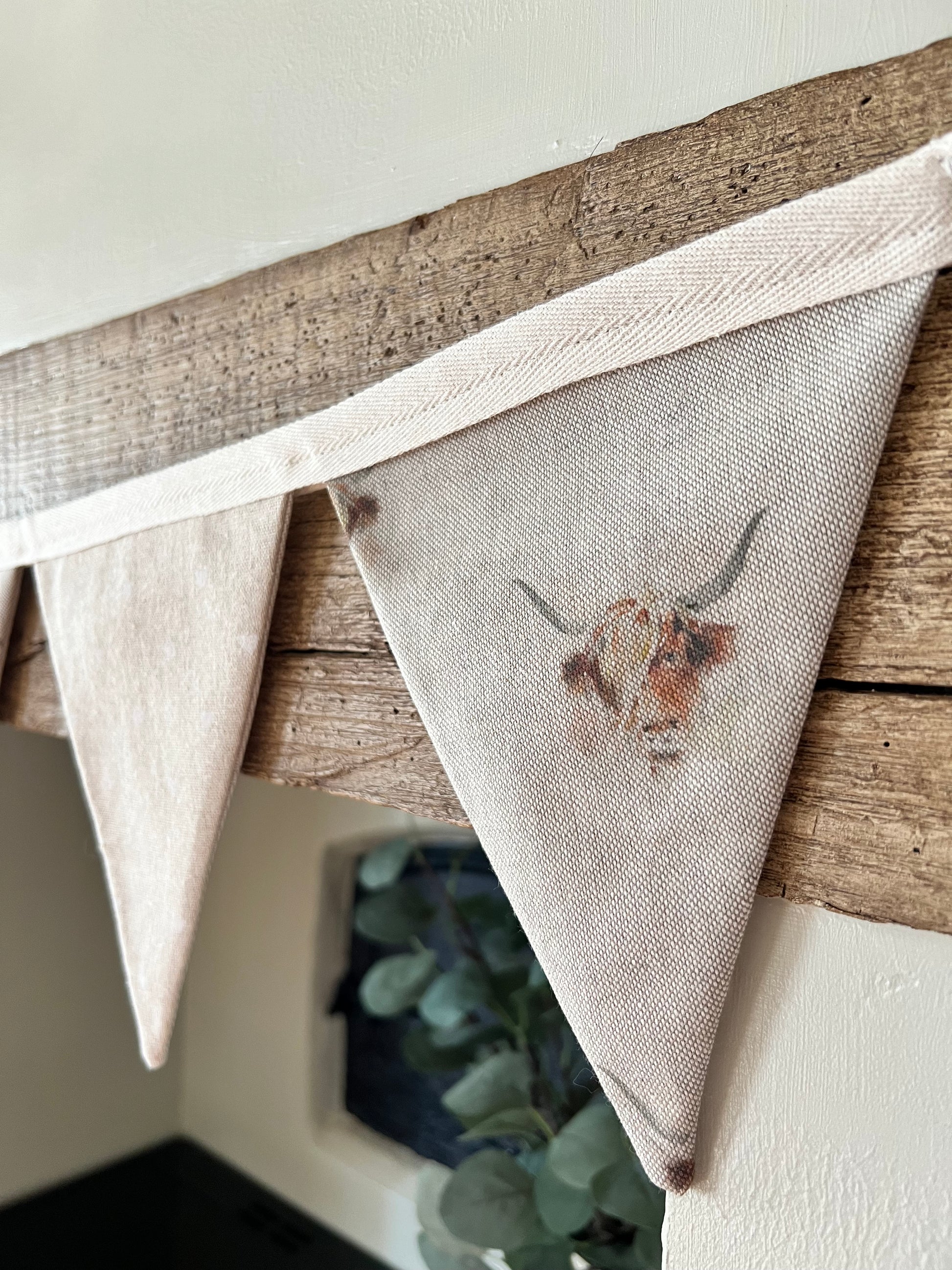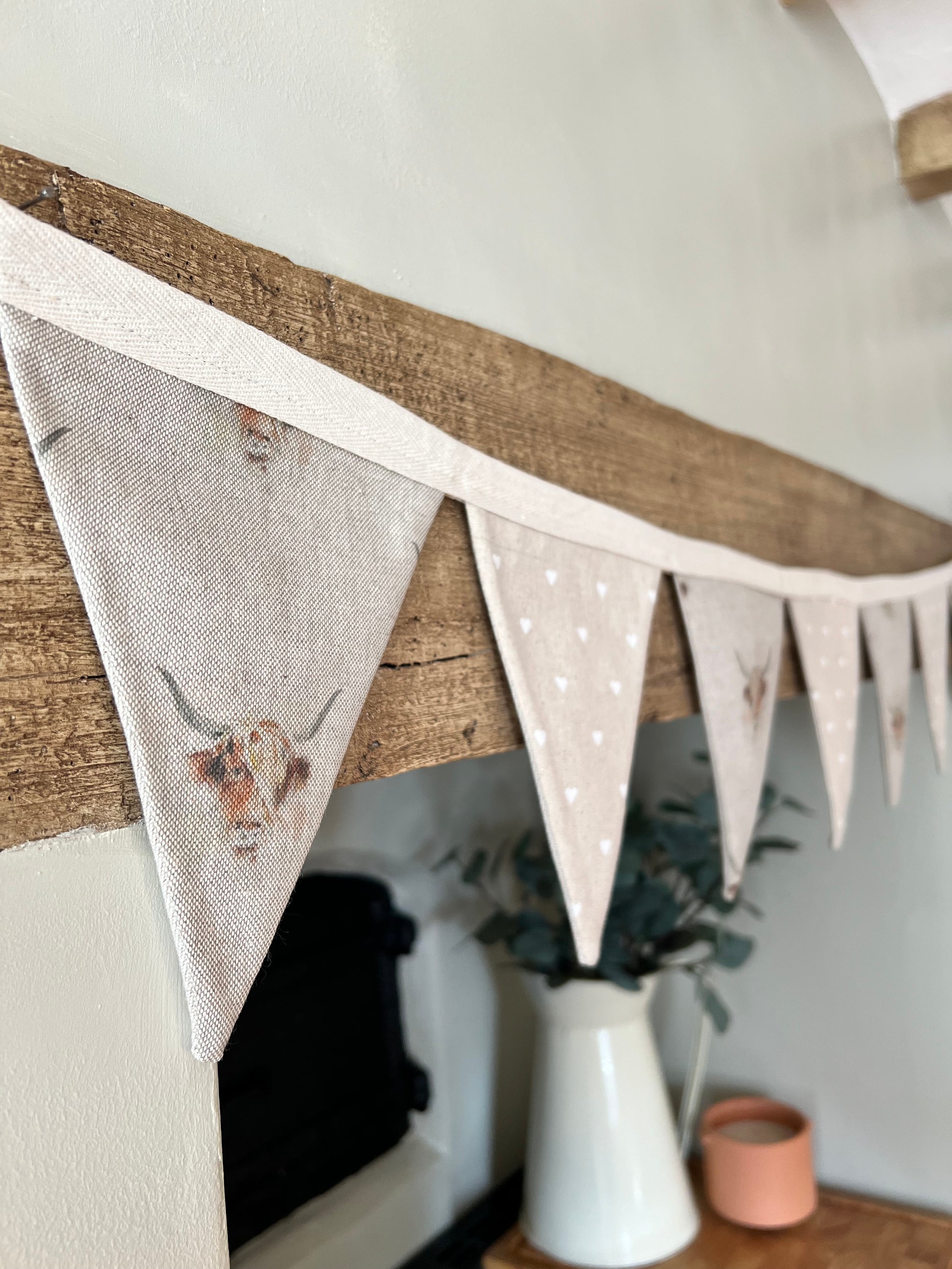 Our gorgeous highland cow and repeated heart print rustic style bunting made from cotton rich fabric and handmade by us at the Cottage! Each bunting is made to order and makes a lovely addition to any home. They are approximately 1.3 metres in length but due to each one being handmade no two are exactly the same.