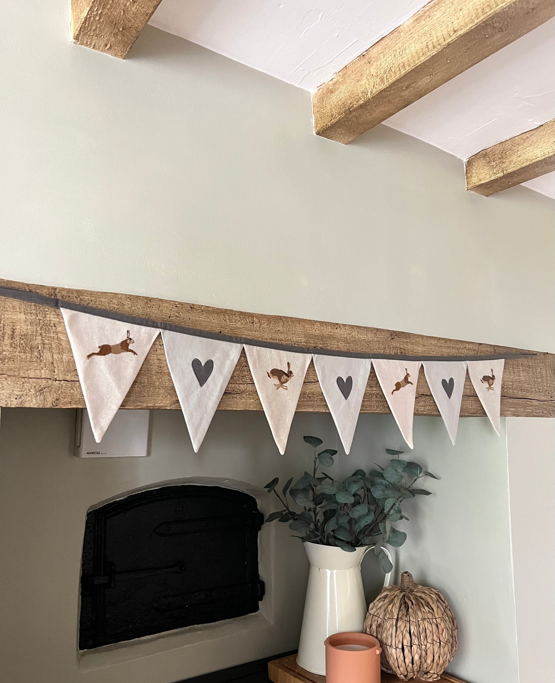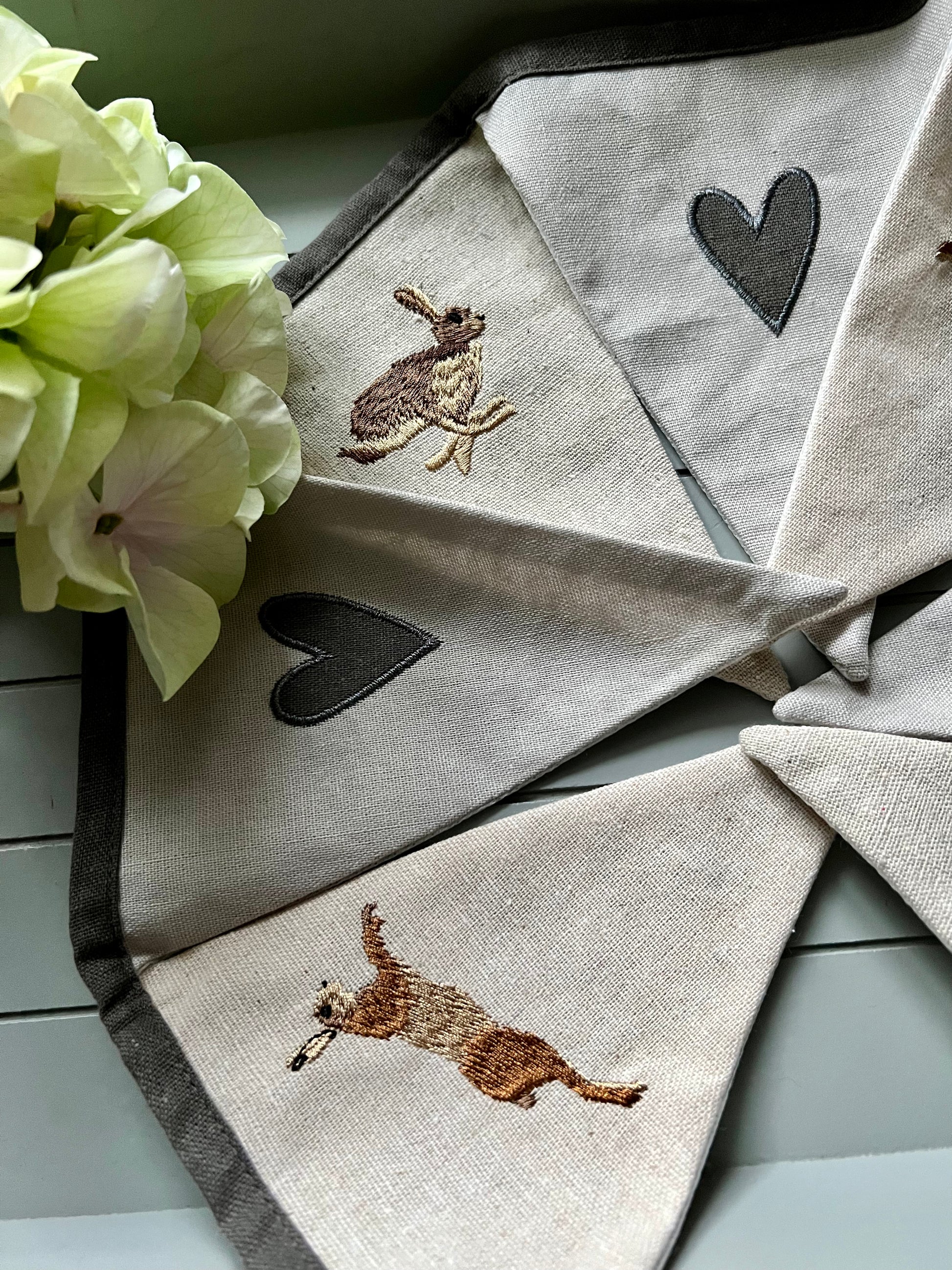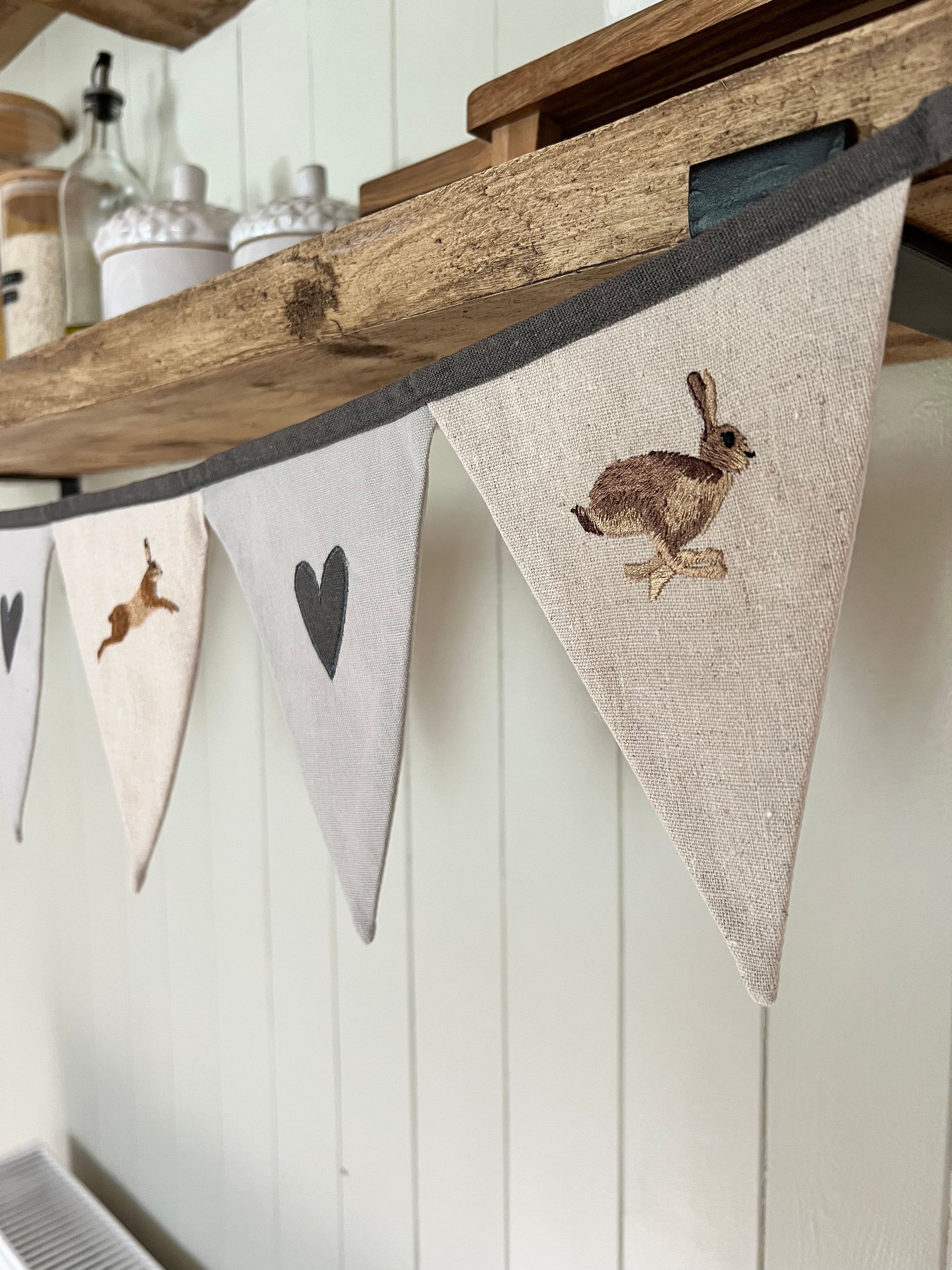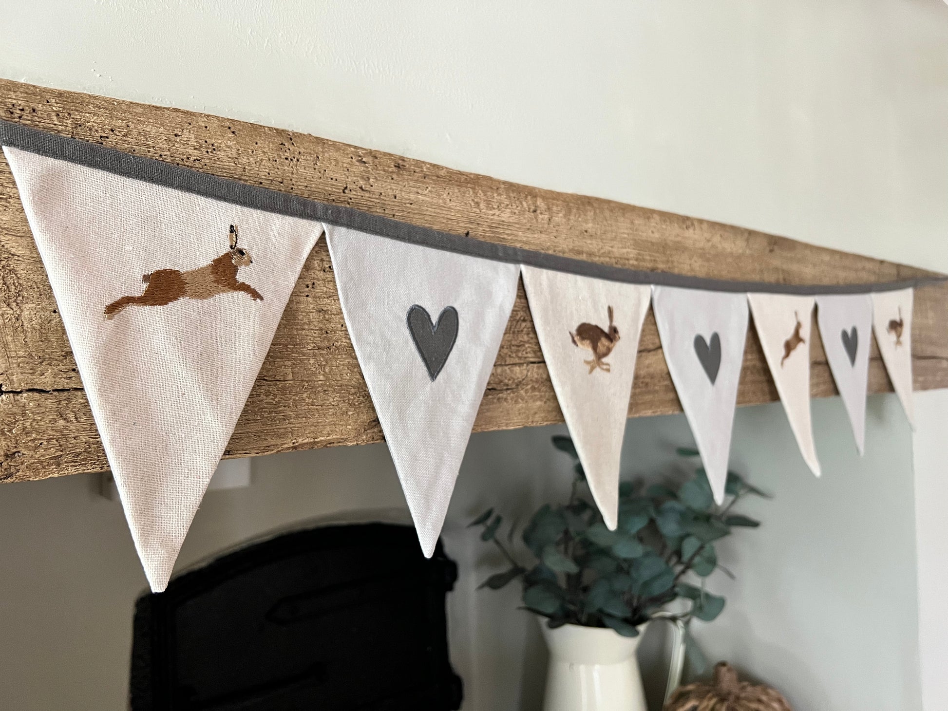 Absolutely gorgeous bunting with running hare and love heart embroidery. One of our favourite products which looks stunning hung in any room.