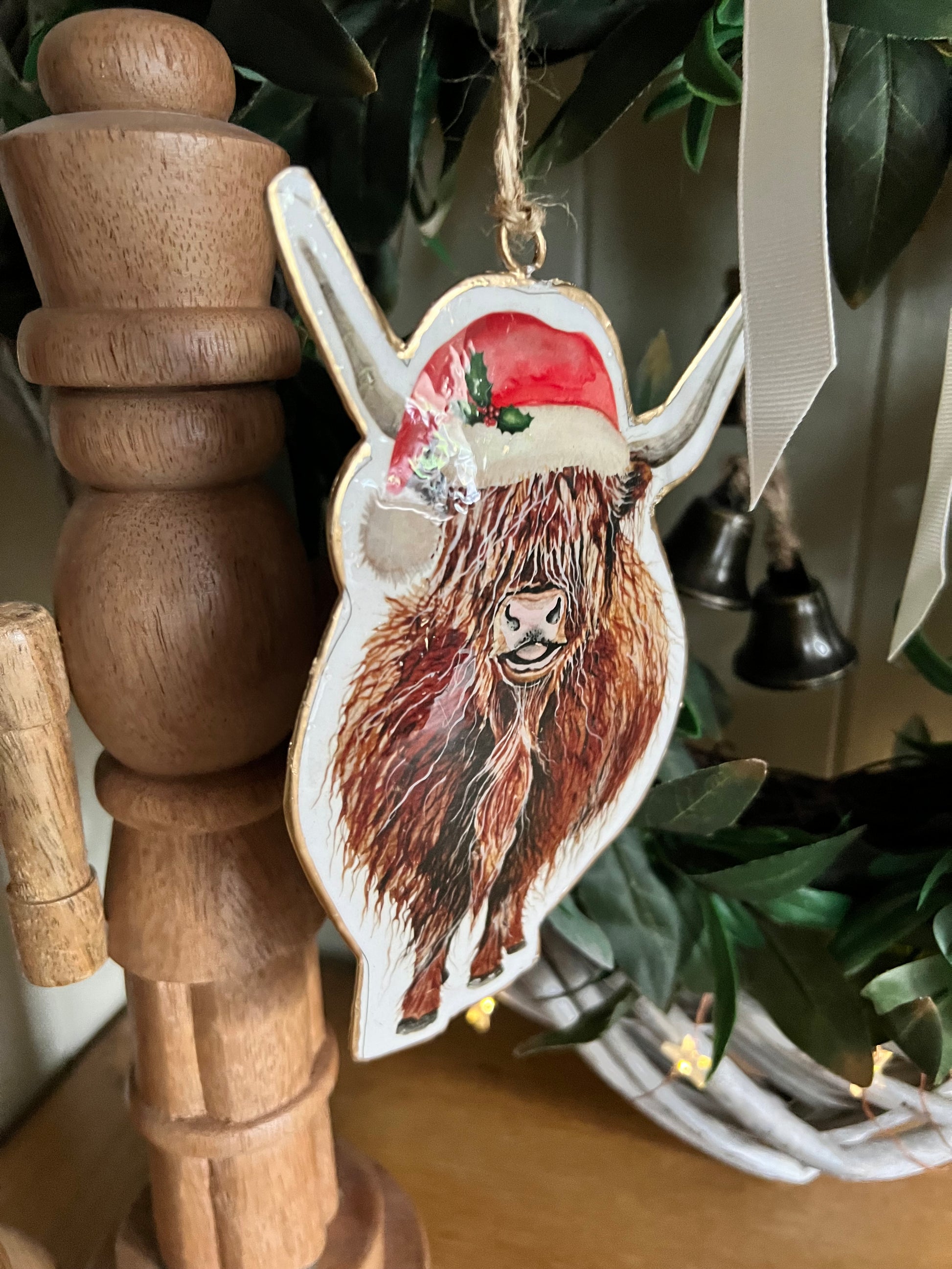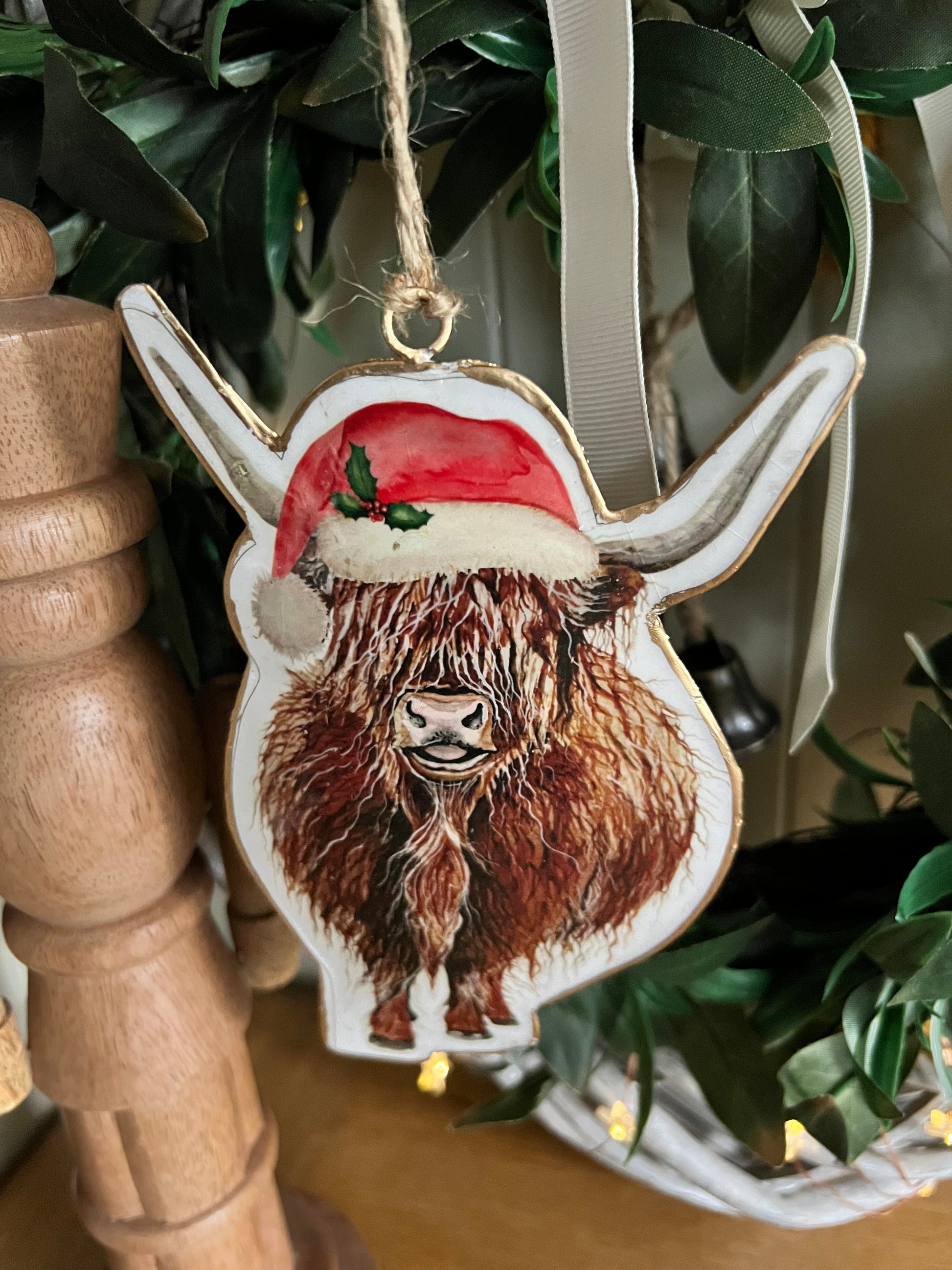 Bring a touch of countryside charm to your festive decor with this adorable Highland Cow Christmas ornament. Featuring a beautifully illustrated Highland cow wearing a classic red Santa hat trimmed with holly, this piece captures the perfect blend of rustic warmth and holiday cheer.