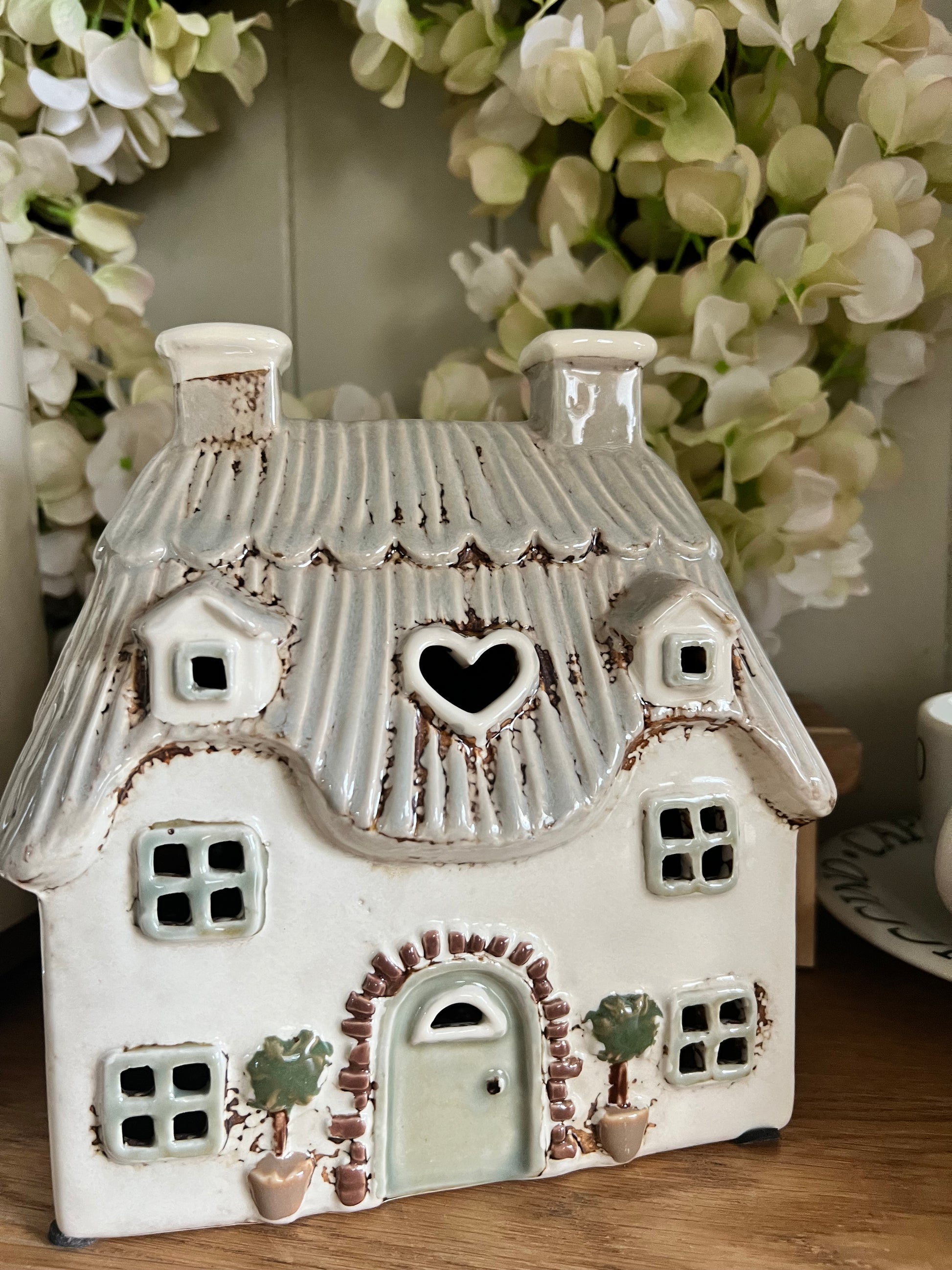 Add a touch of whimsy and warmth to your space with this beautifully crafted ceramic house. Finished in a soft cream with hand-distressed details, this piece features a textured cream roof, sweet white-framed windows, and a heart-shaped cutout that adds extra charm. Delicate raised accents around the door and tiny potted trees give it a storybook feel.