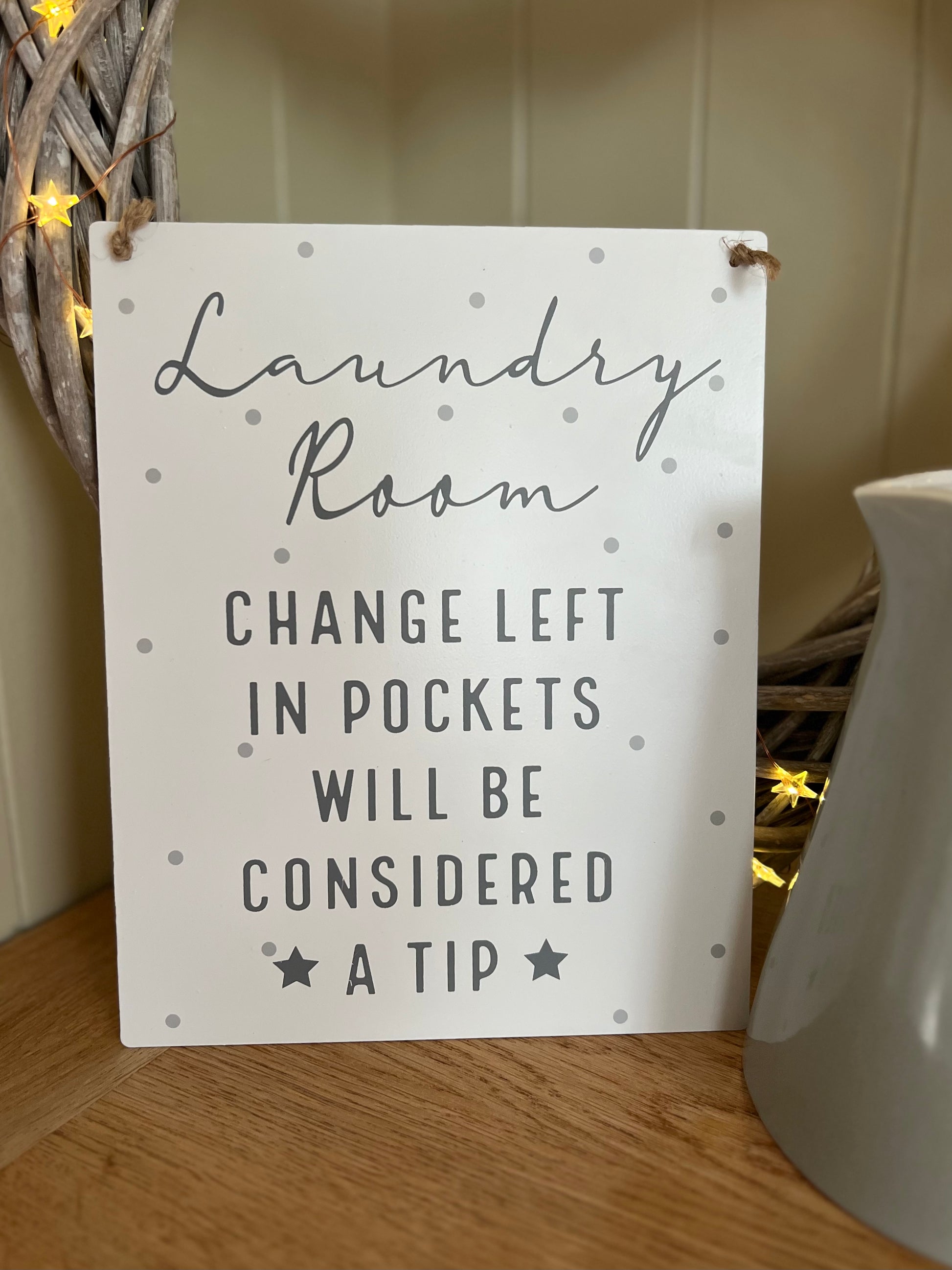 Metal laundry plaque with grey spots and jute string, so cute to hang or place on display in a kitchen or utility room.