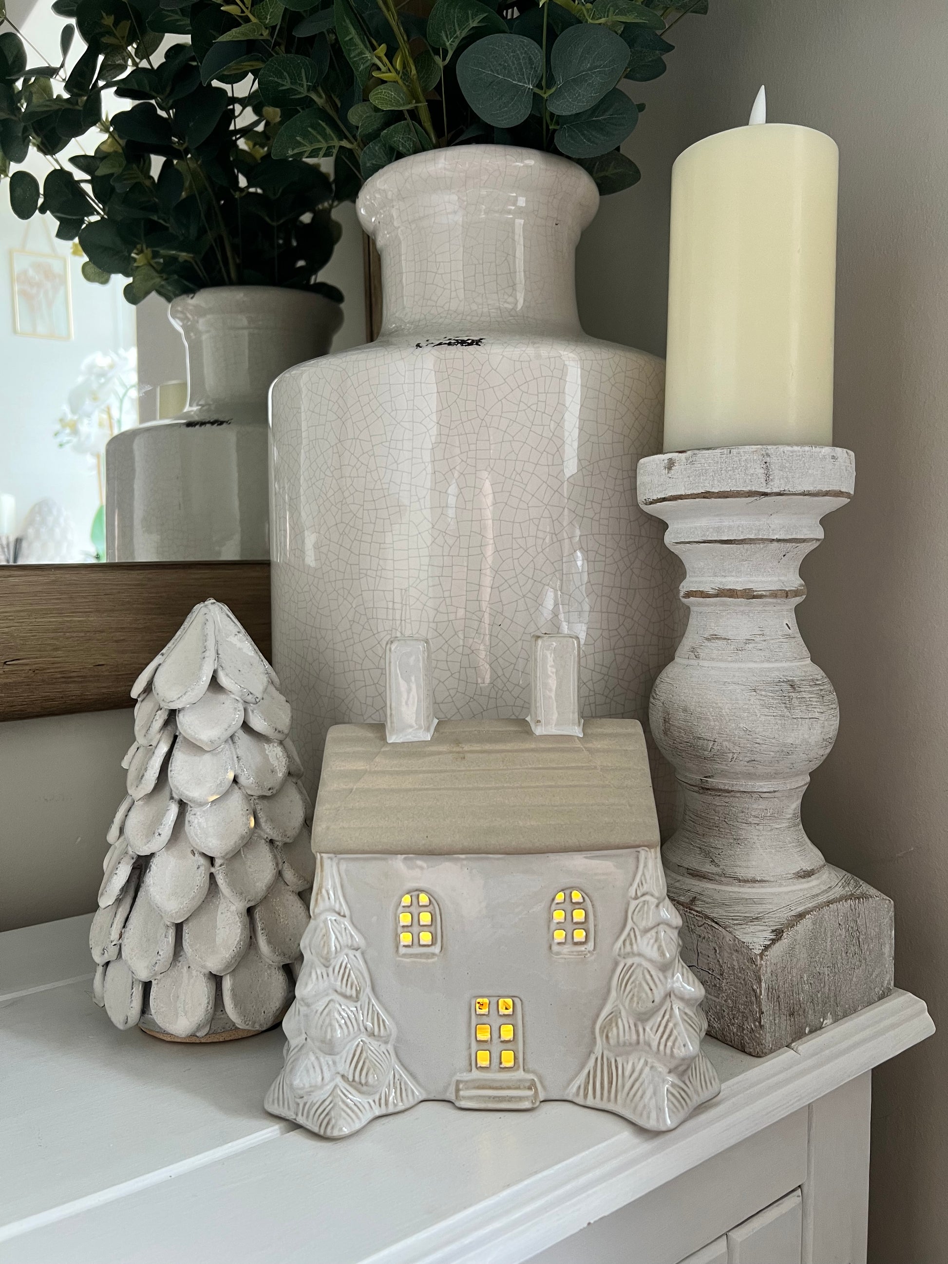 Bring a touch of cosy charm to your decor with this beautifully crafted ceramic LED house. Designed in a warm, matte-glazed white, this petite cottage features delicately sculpted evergreen trees on each side and softly rounded windows that glow with a warm, inviting light. The textured roof and twin chimneys add to its quaint, handcrafted feel, while the gentle crackle-finish accents in the surrounding décor enhance its timeless appeal.