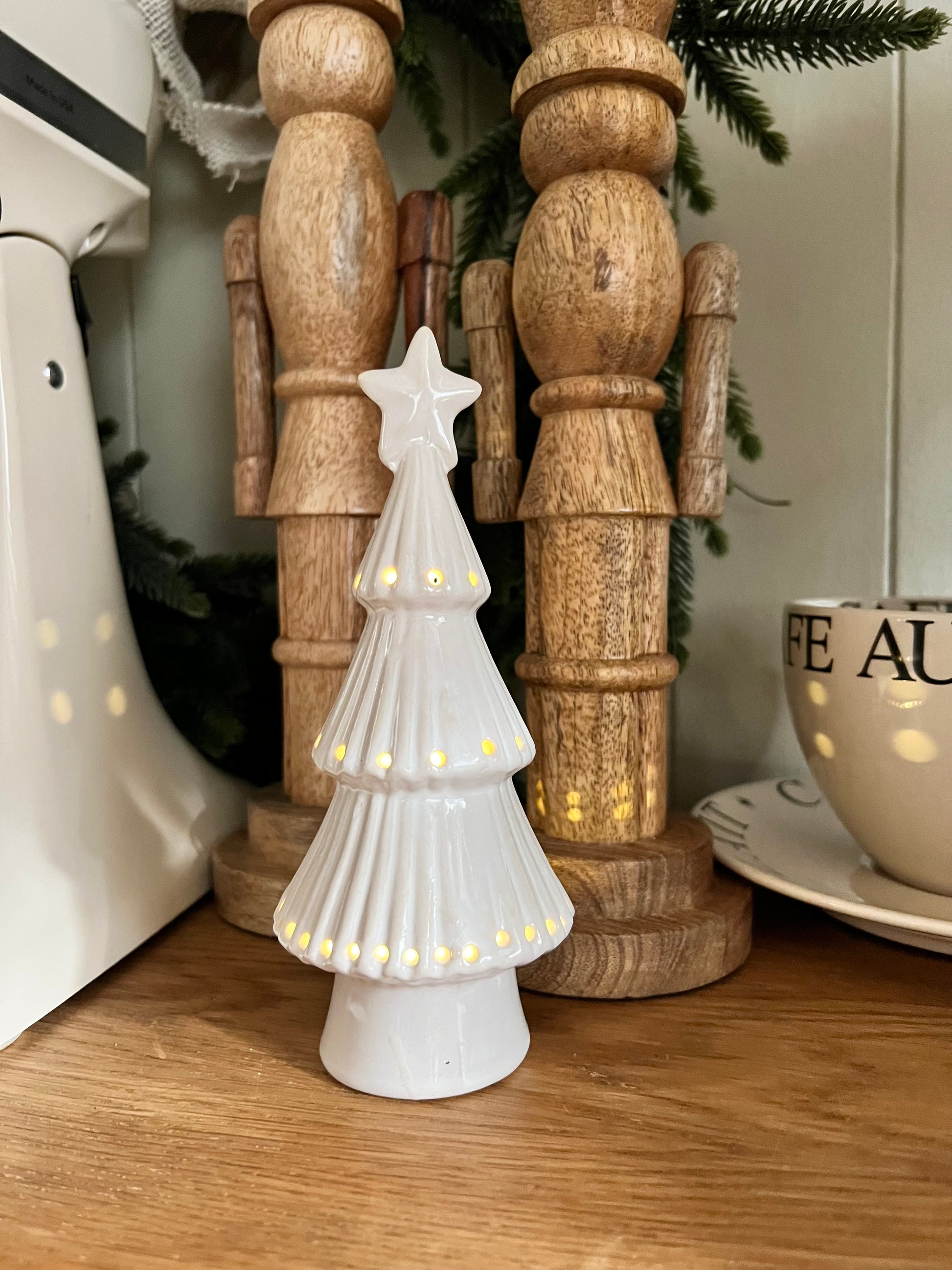 An elegant dainty porcelain Christmas tree ornament that glows brightly from within, with warm white LED lights.