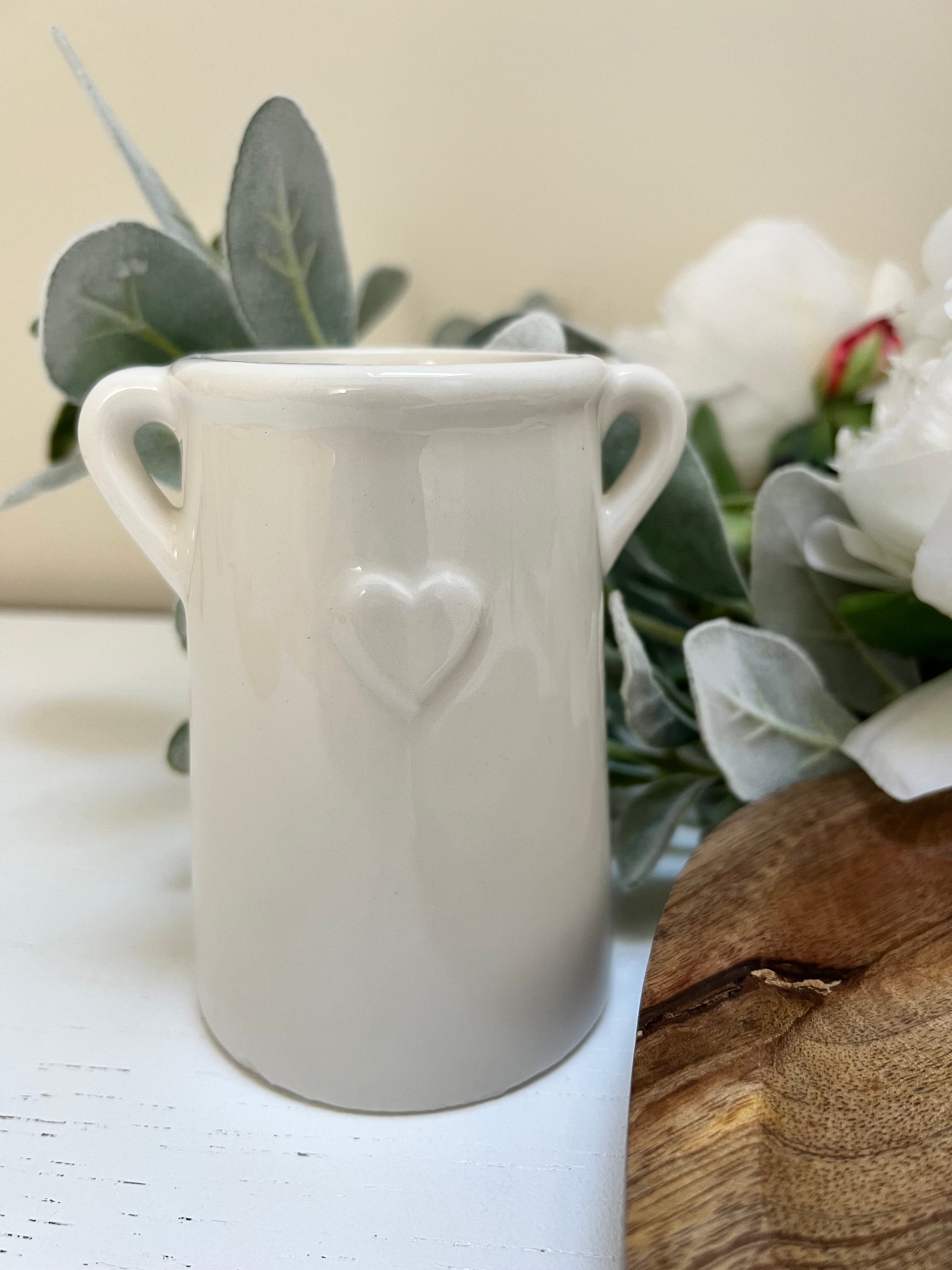 A white ceramic planter with eared design and embossed heart detail. A simple yet stylish planter perfect for a small plant or for displaying as is.