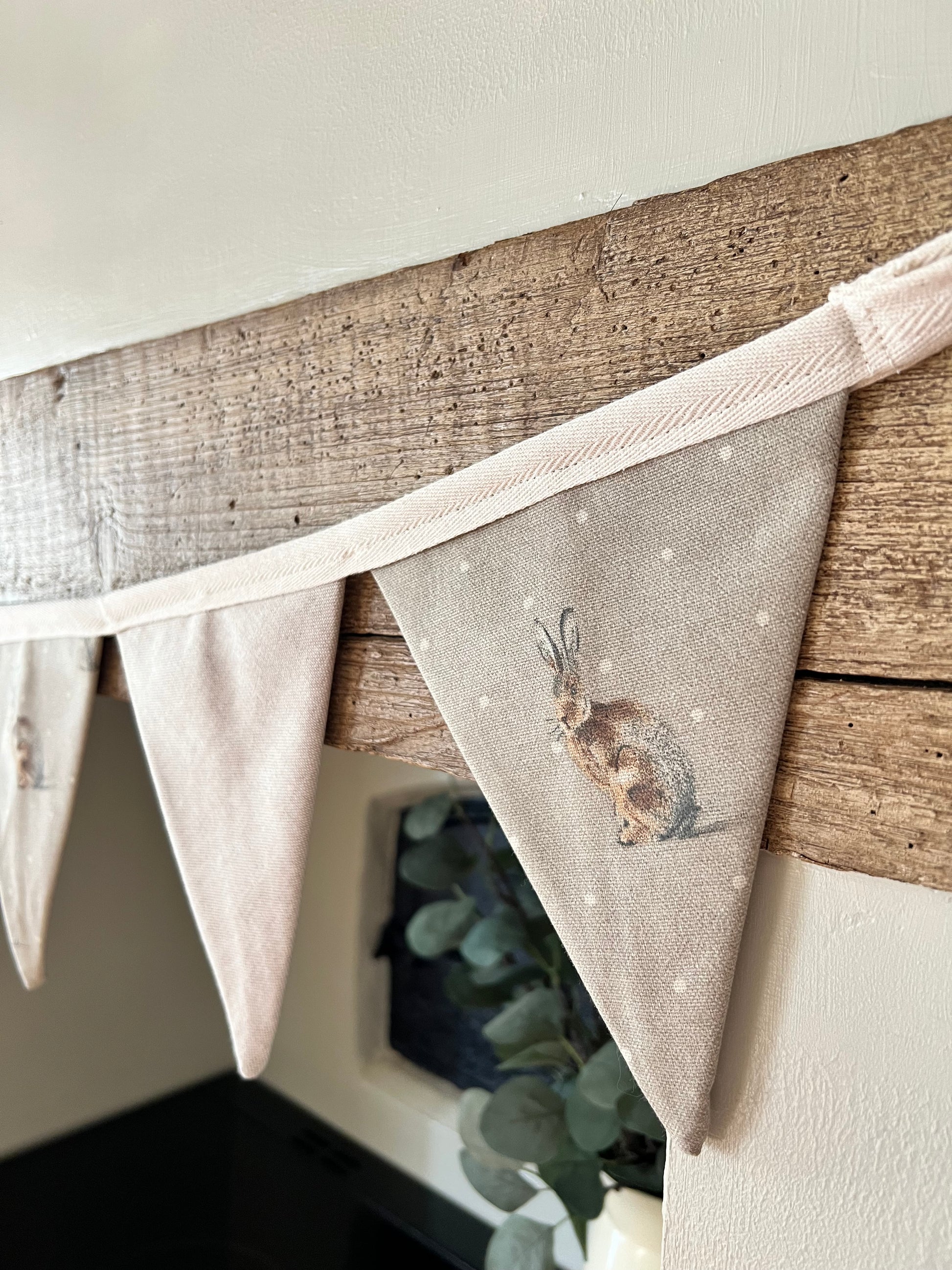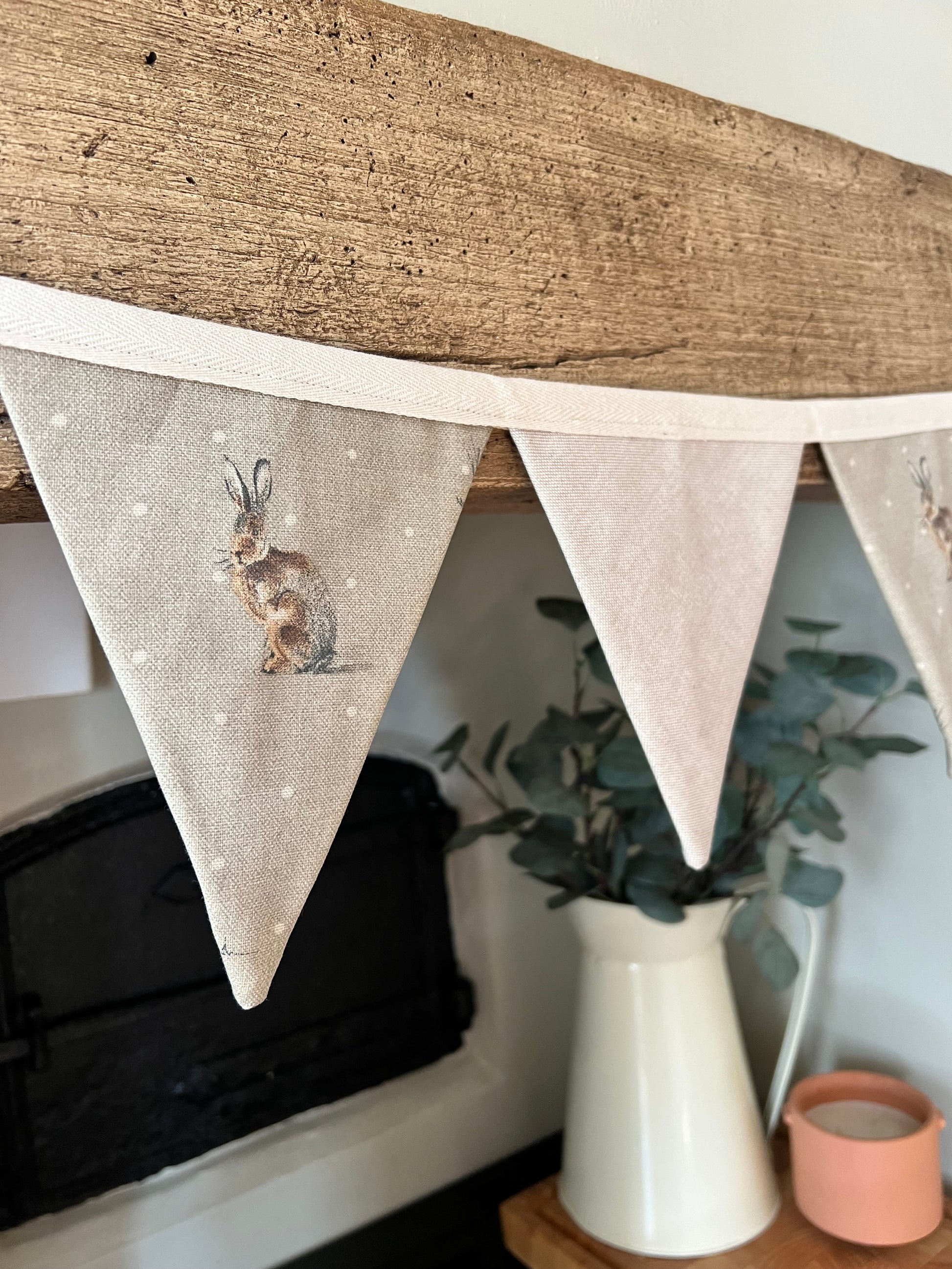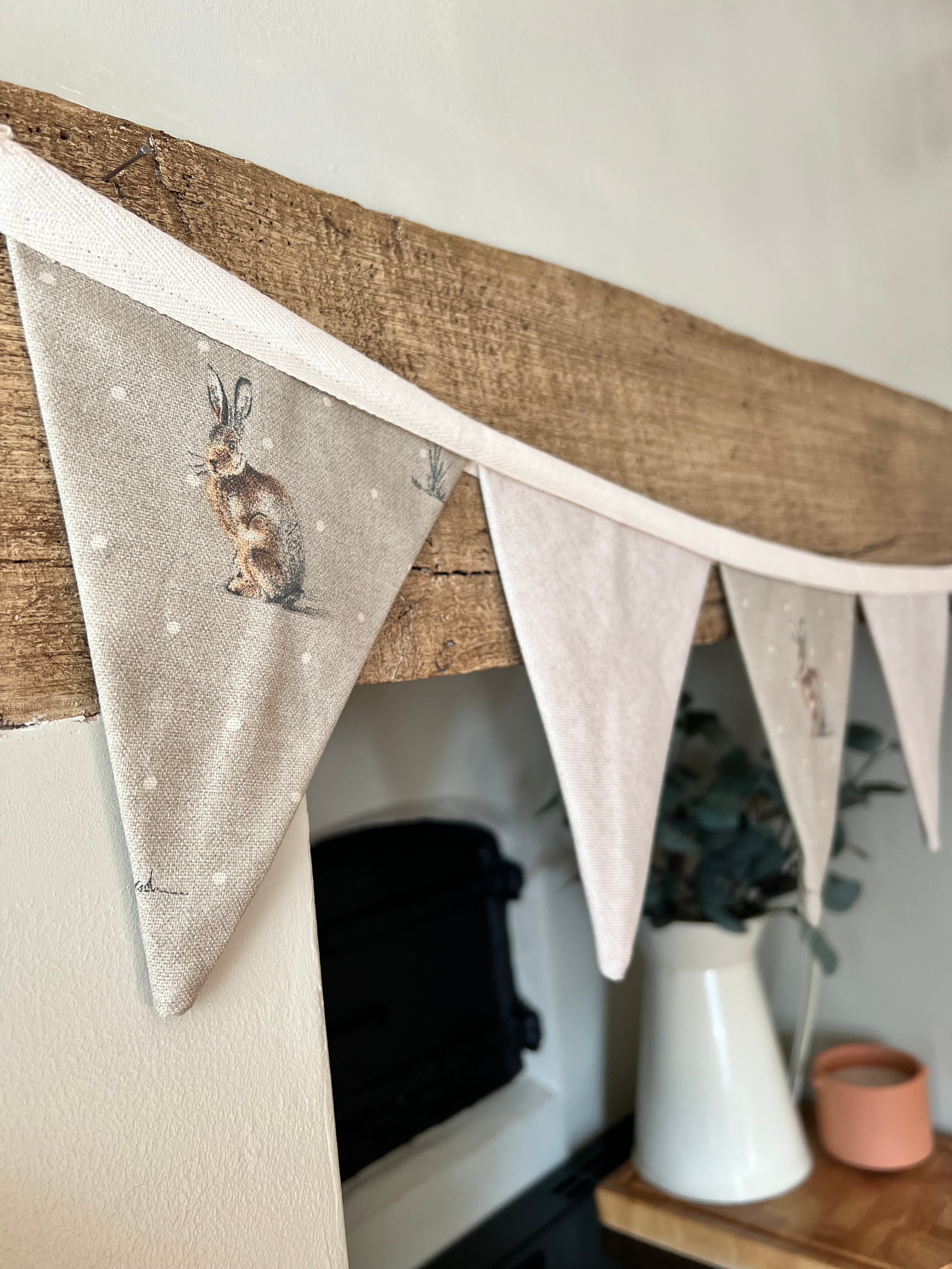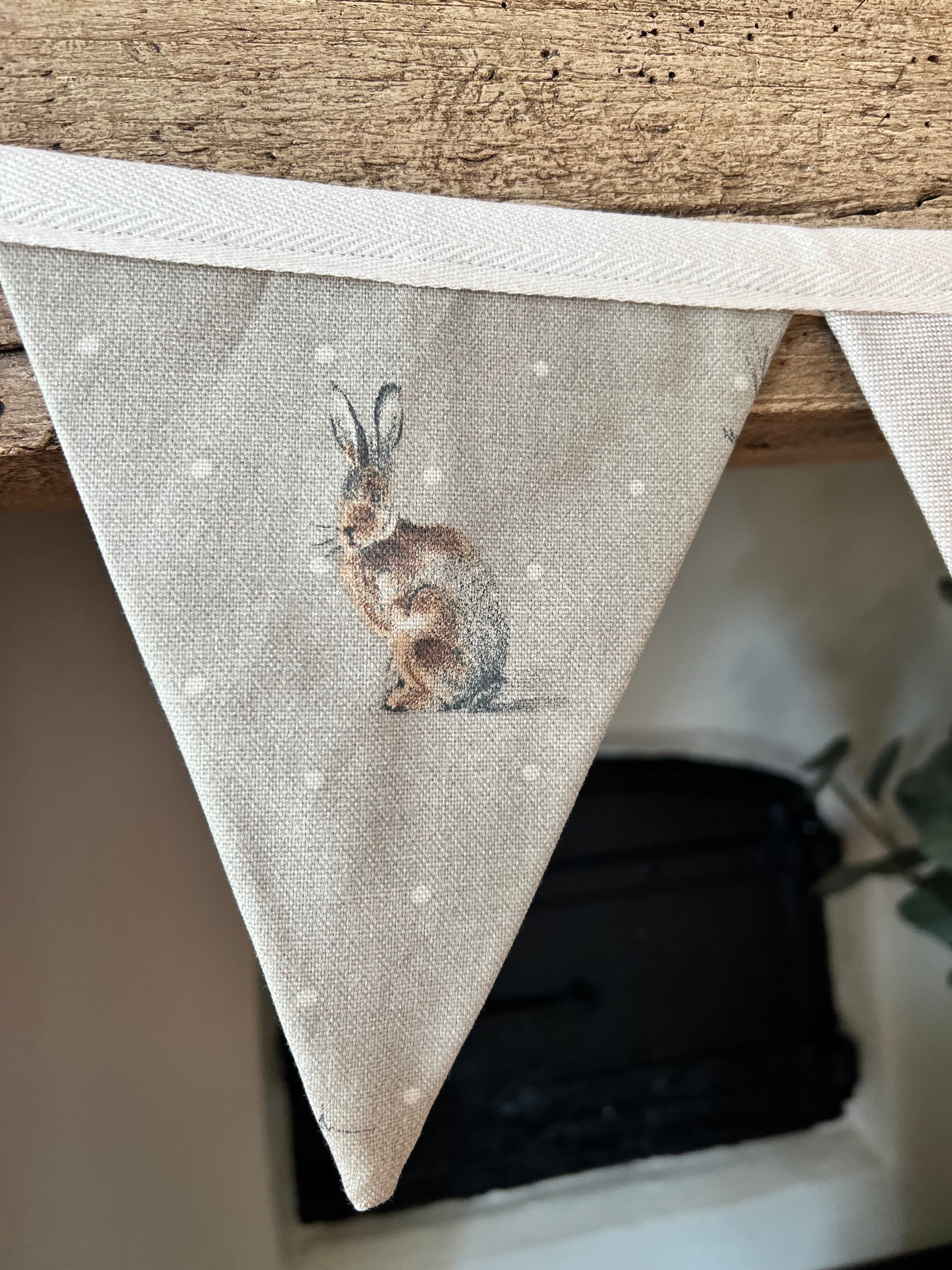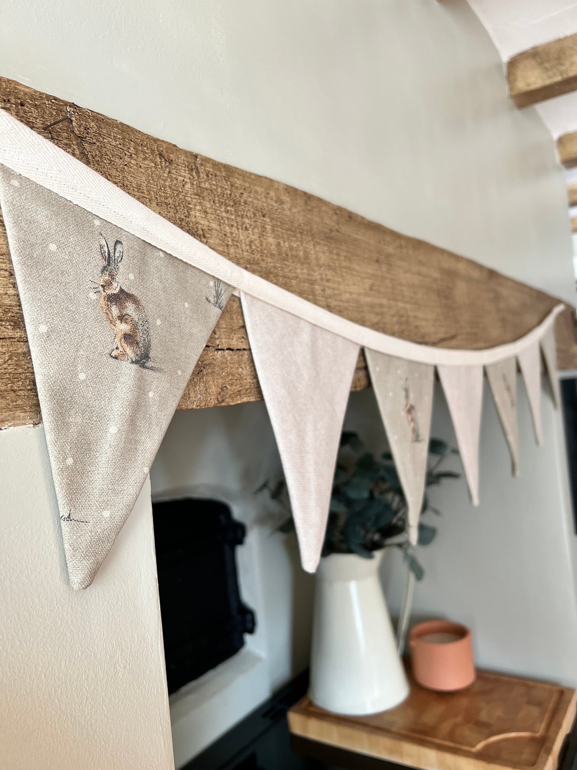 Our gorgeous sitting hare and neutral rustic style bunting made from cotton rich fabric and handmade by us at the Cottage! Each bunting is made to order and makes a lovely addition to any home. They are approximately 1.3 metres in length but due to each one being handmade no two are exactly the same.