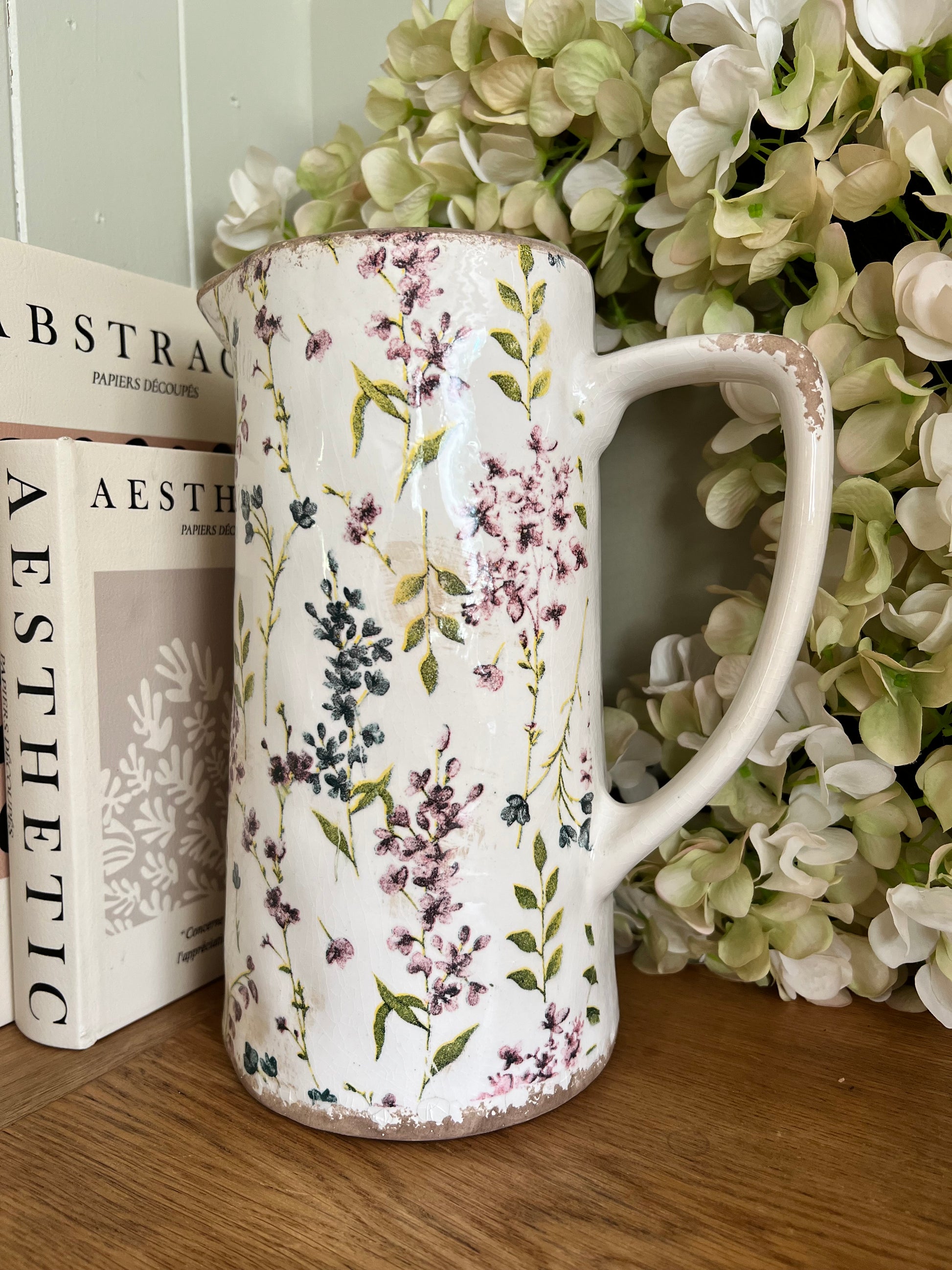 A gorgeous tall distressed decorative ceramic jug with a purple and green floral design.