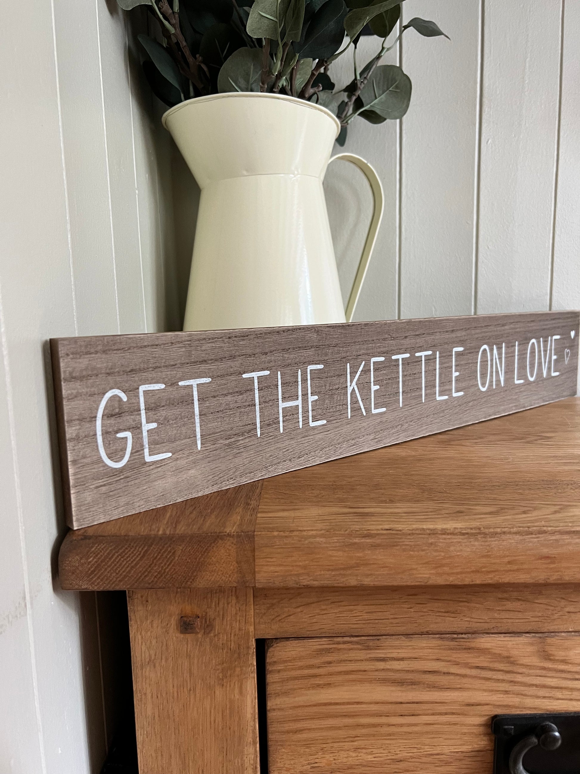 A large wooden sign embossed with the phrase ‘get the kettle on love’. A gorgeous homely sign that comes with two hanging attachments ready to hang up on a wall in your home or place on display.