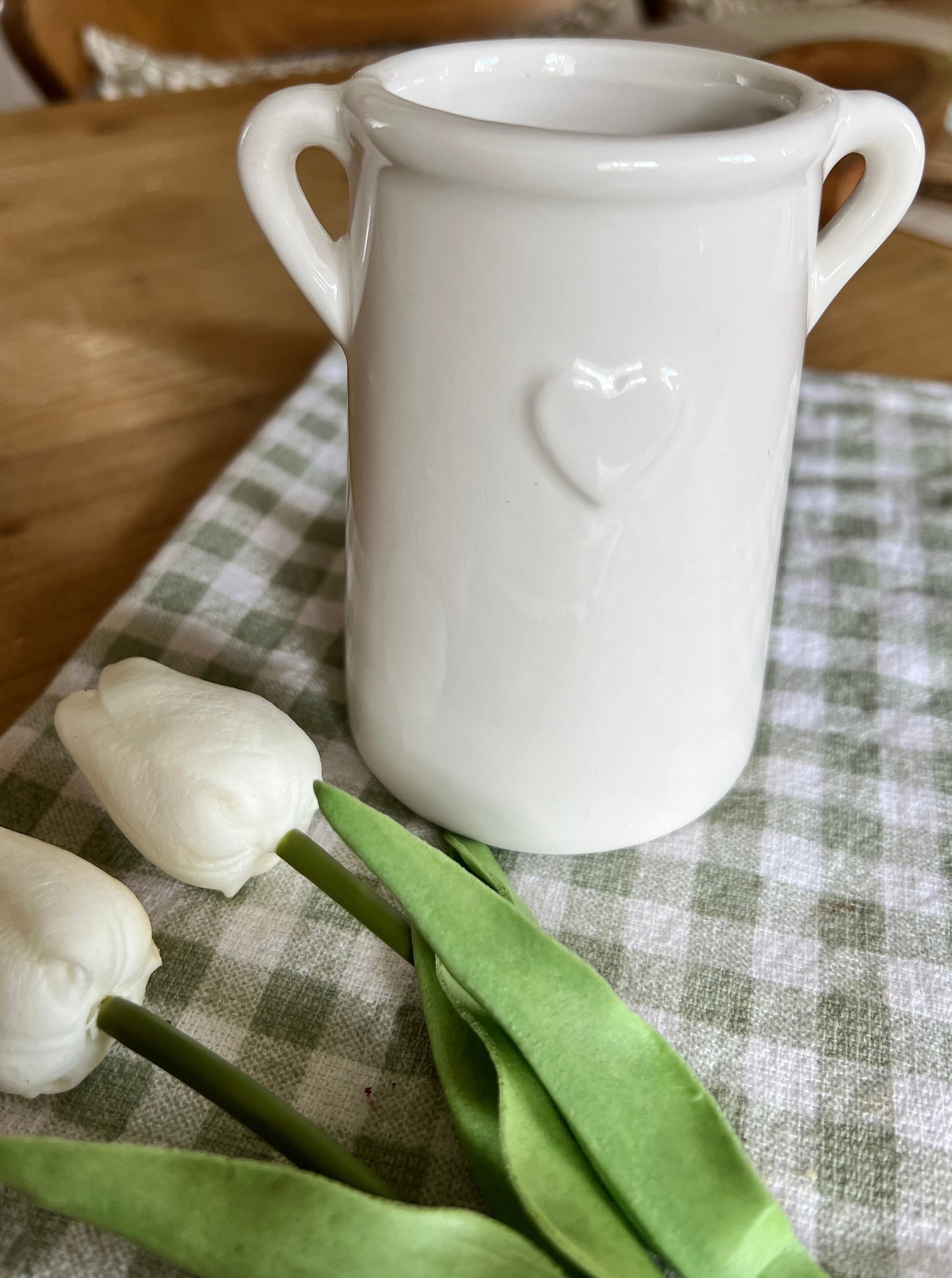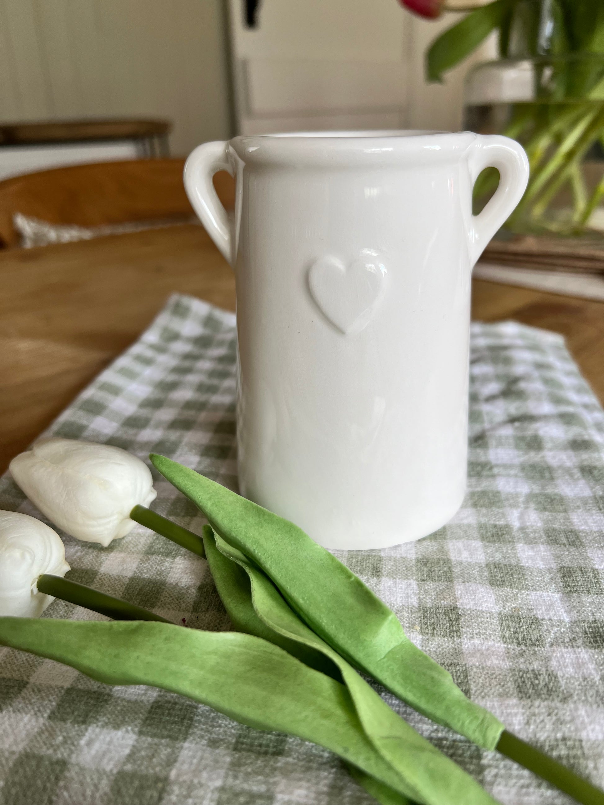 A white ceramic planter with eared design and heart embossed detail. Perfect for a small plant or displaying as is.