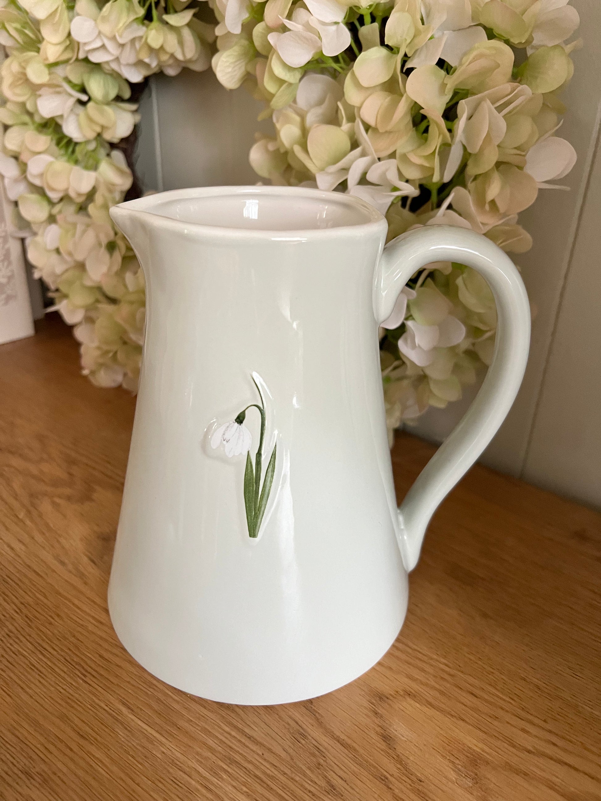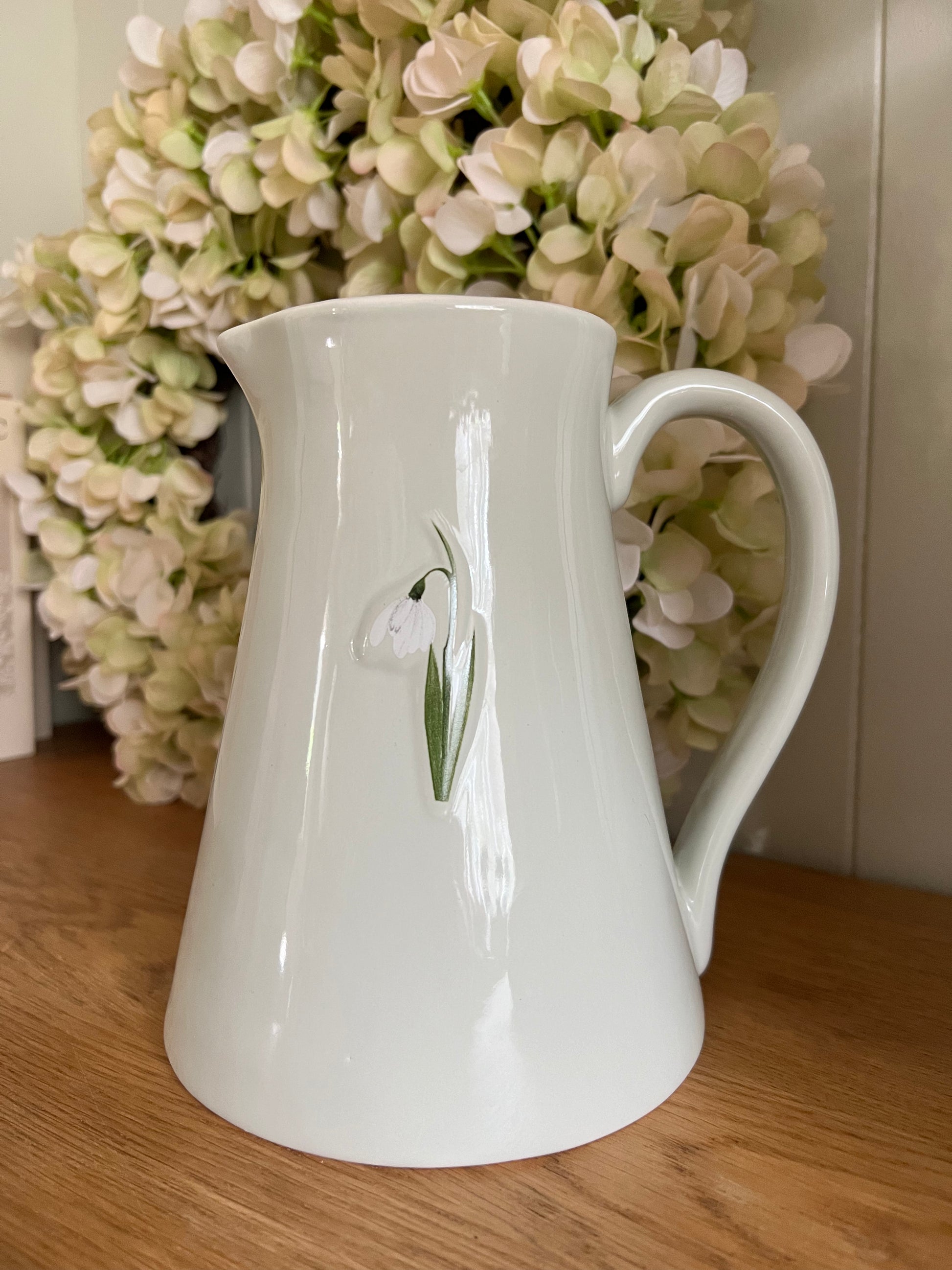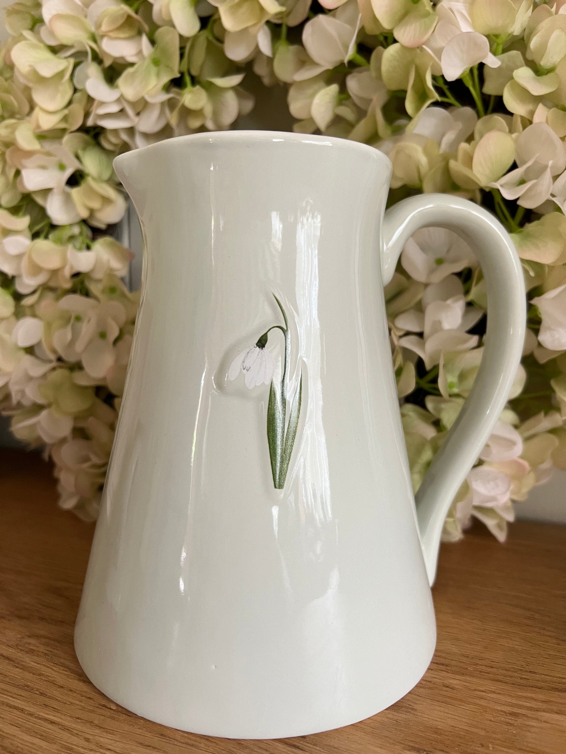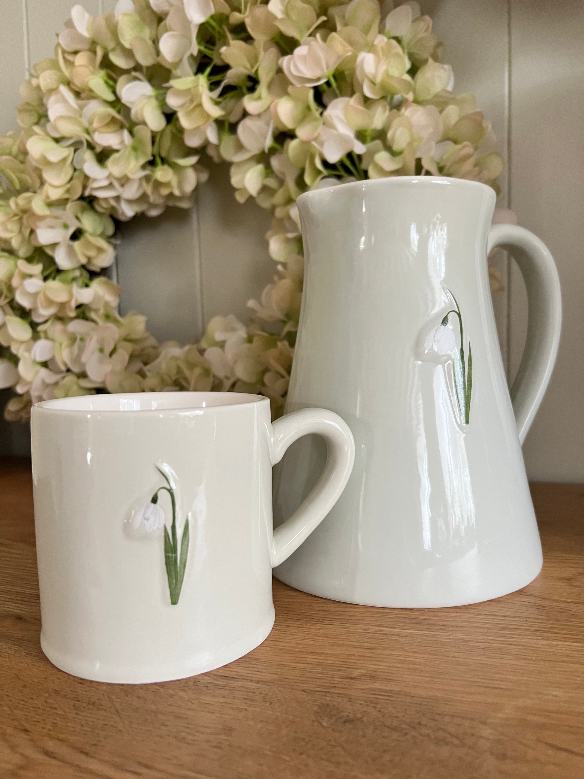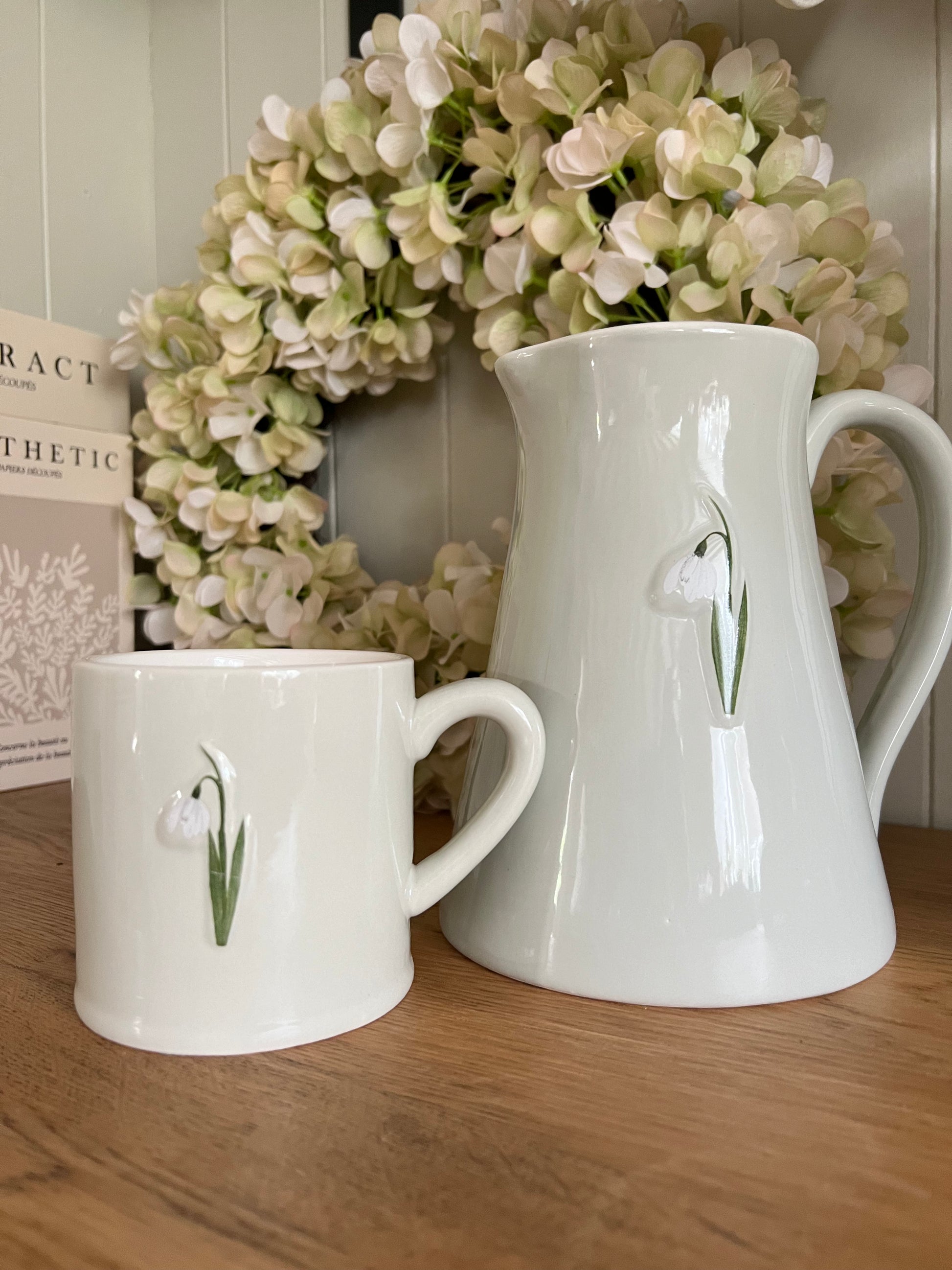 A stunning pale grey stoneware glazed jug with a gorgeous embossed snowdrop flower. A lovely Springtime ceramic that can be bought alongside a matching mug.