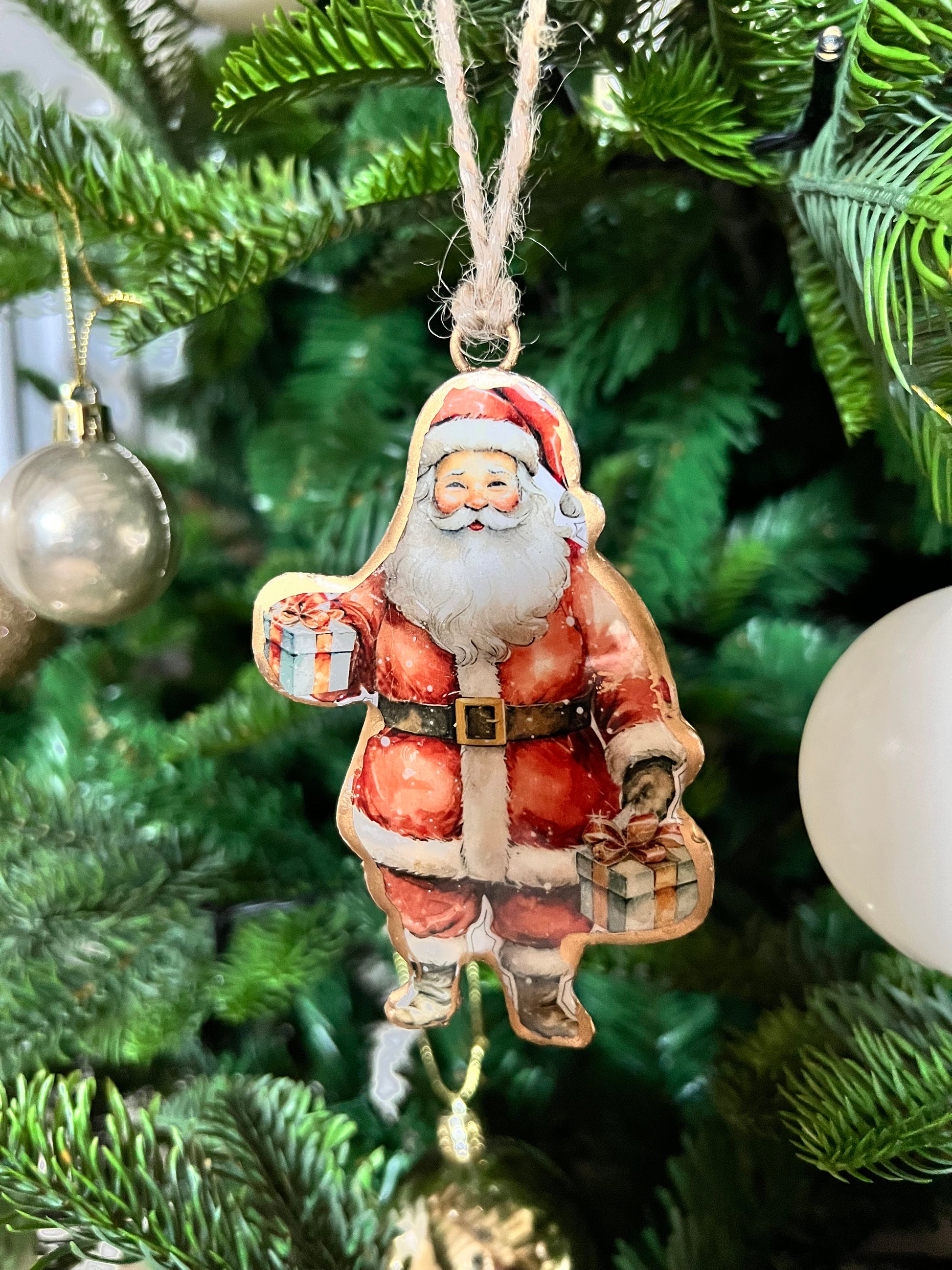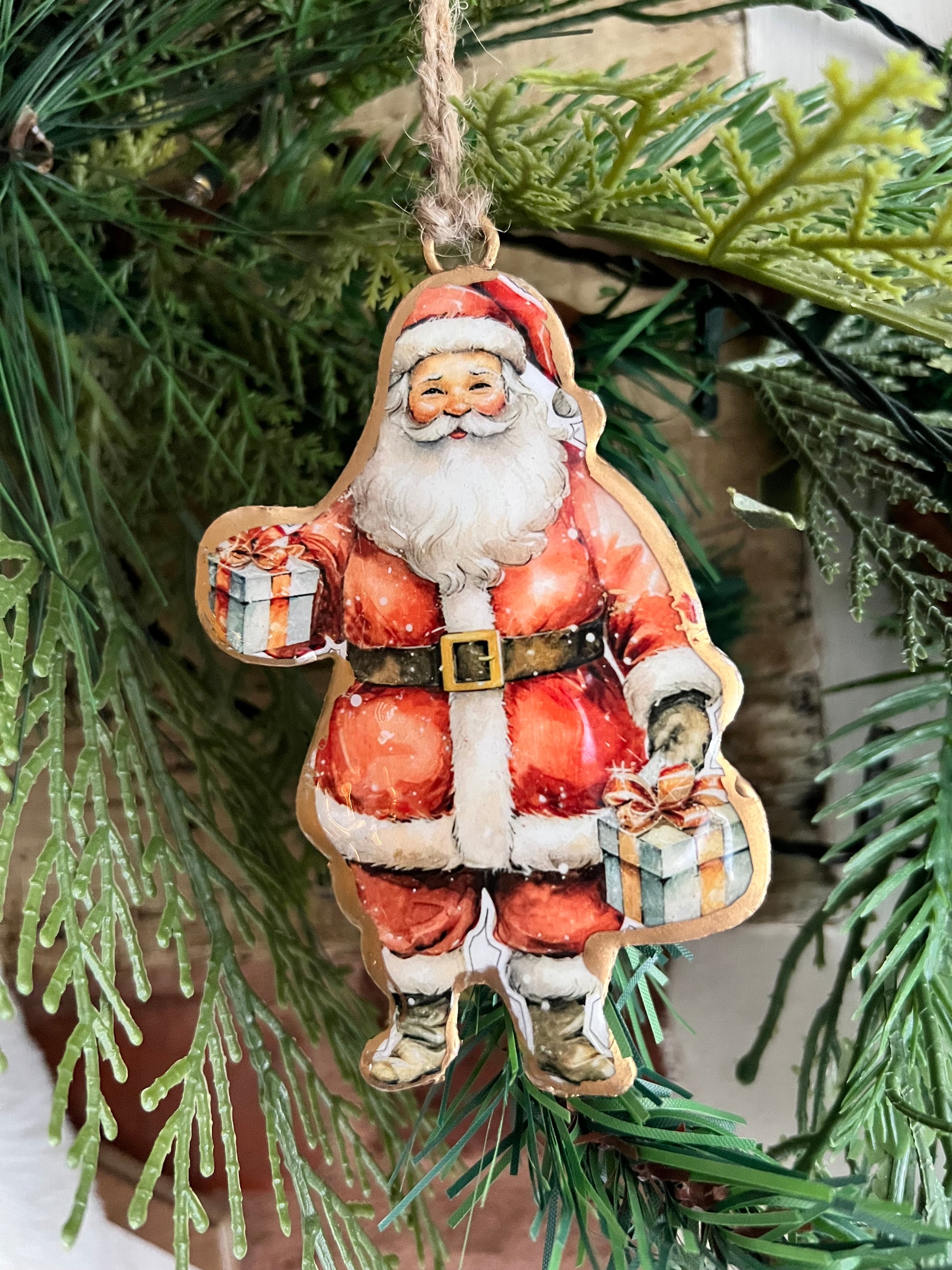 A gorgeous vintage style metal Christmas hanger featuring Santa himself carrying some Christmas presents. The same design is on both sides.