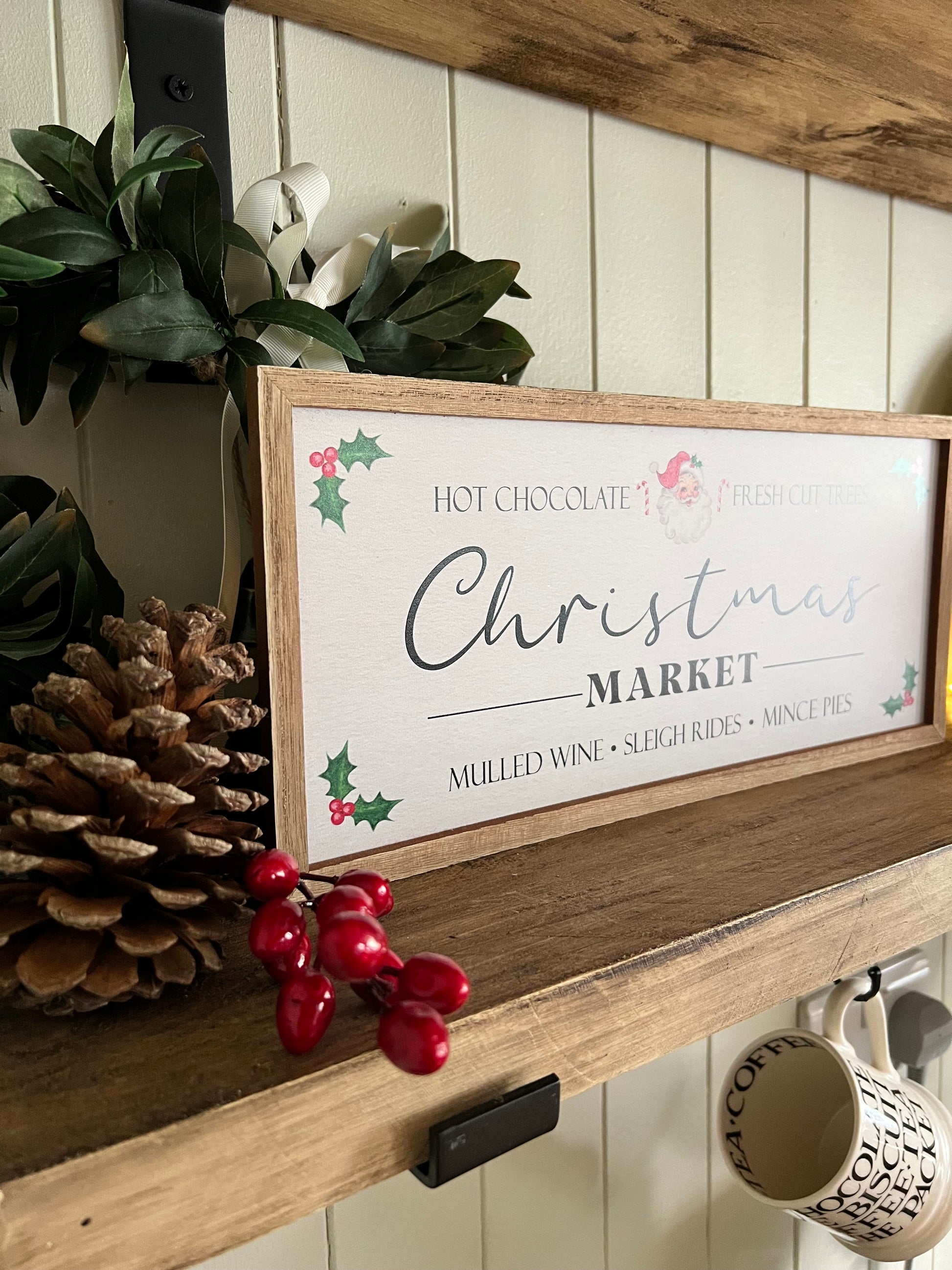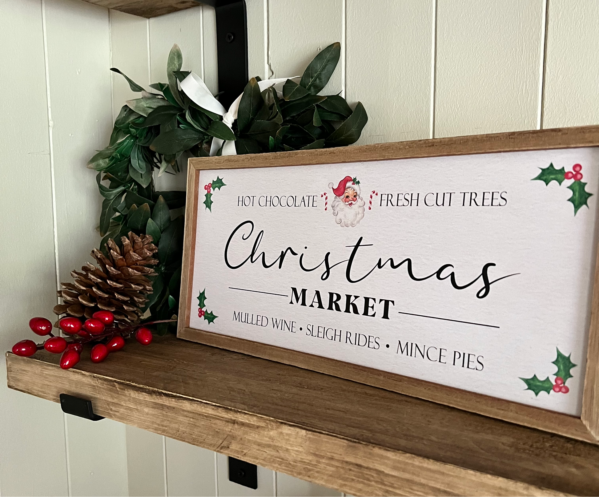 A vintage style wooden Christmas plaque which can be hung up on the wall or displayed on a shelf or sideboard. A beautiful seasonal piece perfect for getting into the festive spirit.