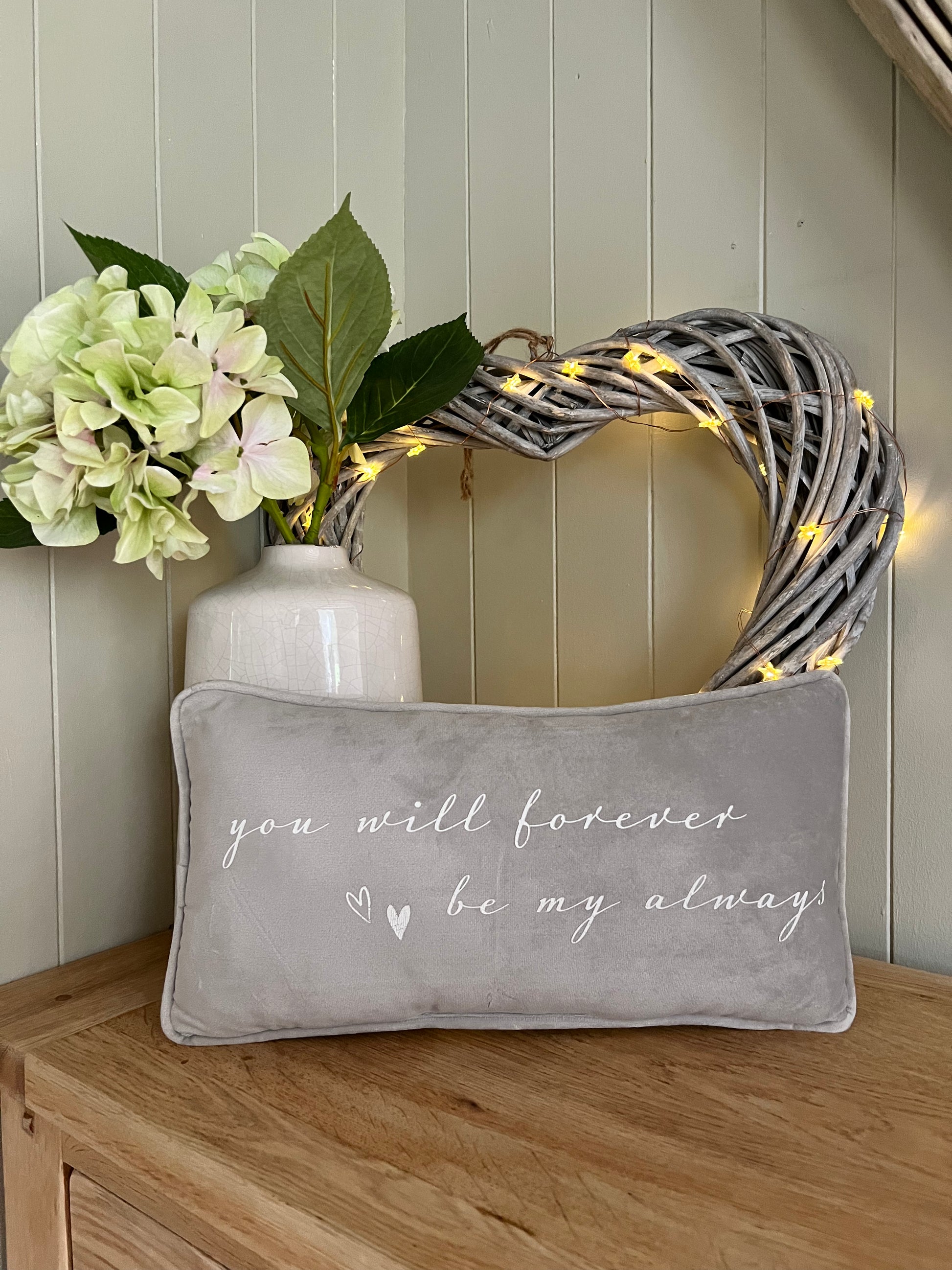 A luxury grey velour feel cushion with ‘you will forever be my always’ printed onto it. Super soft and looks cute as a scatter cushion on an armchair, bed, or sofa. Hand wash only.